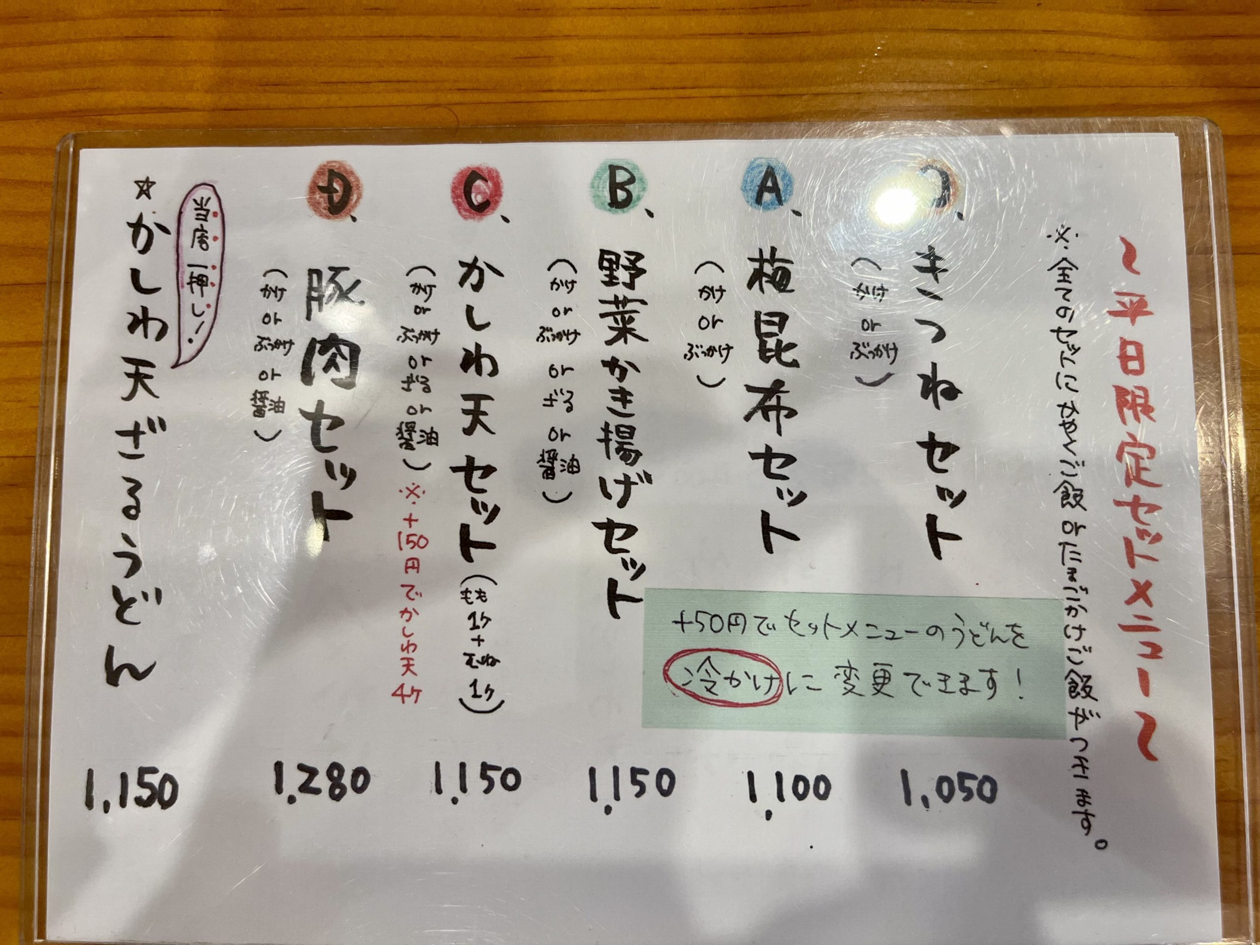 このお店は,とにかくうどんの麺の美味しさを最大限に楽しむのがポイントなのでいつもは「冷やかけ」ばかり注文していたのですが,お得な平日限定のセットメニューに惹かれてしまいました。