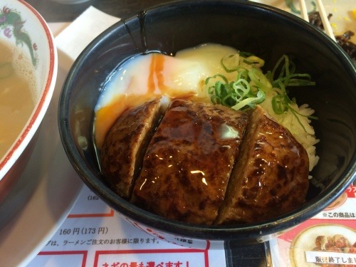 この、まんぷく丼、具はハンバーグと半熟玉子という、ラーメン屋で頼むにはジャンクな匂いがプンプンするシロモノですが、お得感に負けてついつい頼んでしまいました。