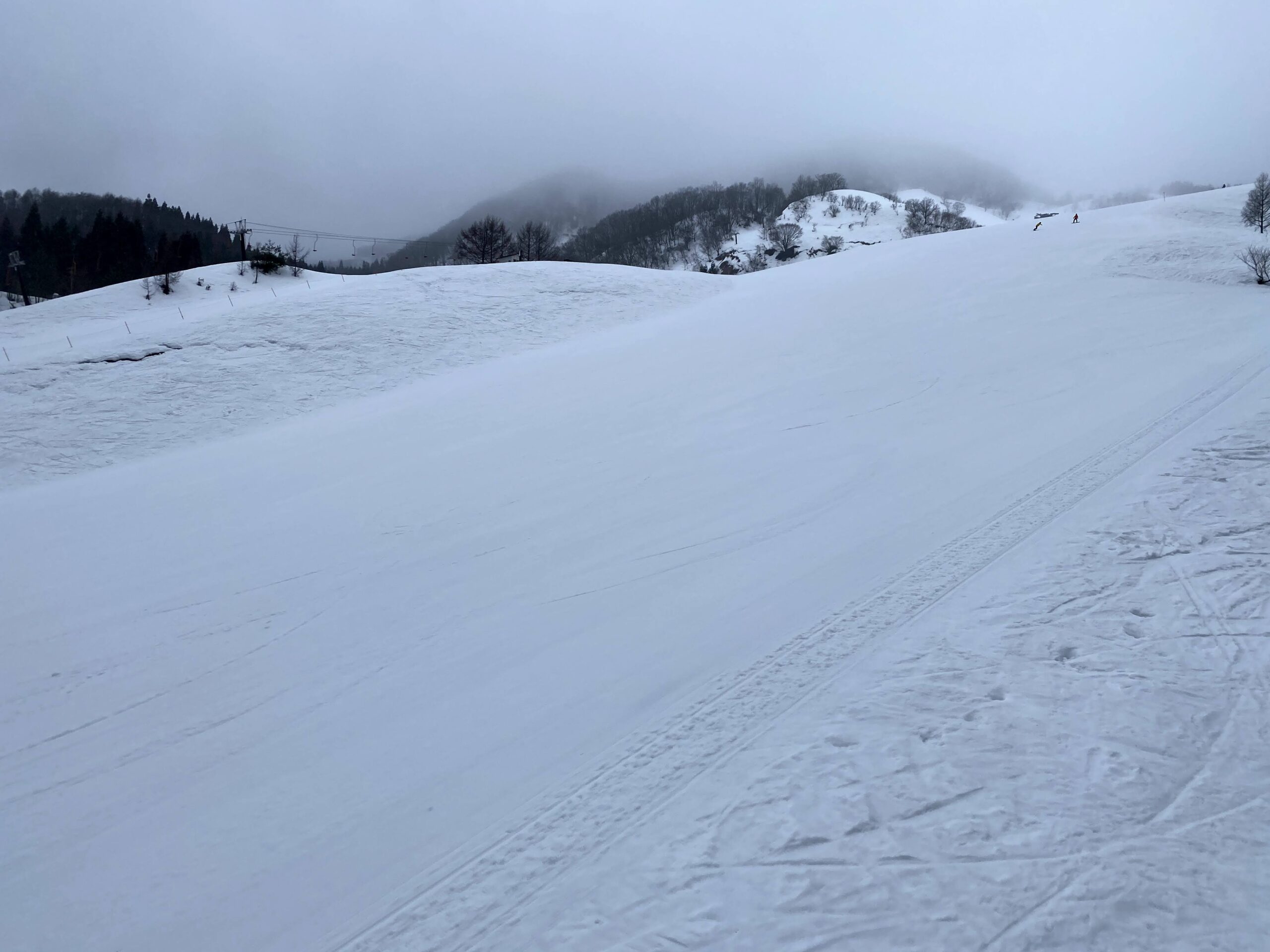 やはり予報の通りの雨の中準備して,ゴンドラでゲレンデに上がって滑り出すと少し硬めのグルーミングバーンに雨水が乗っかってスキーがよく走る。