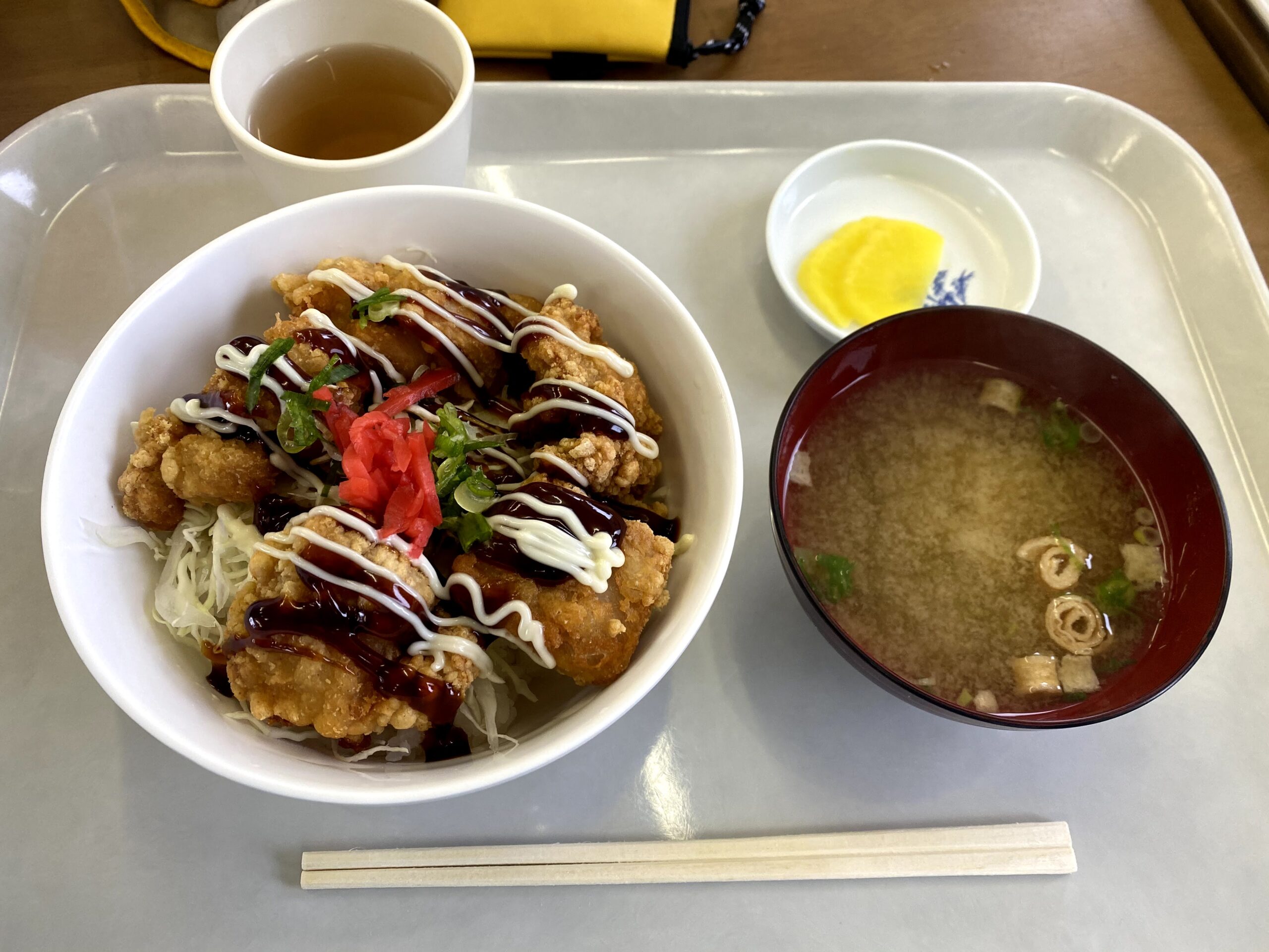 お味噌汁付きに惹かれて「から揚げ丼」(900円)をいただきました。