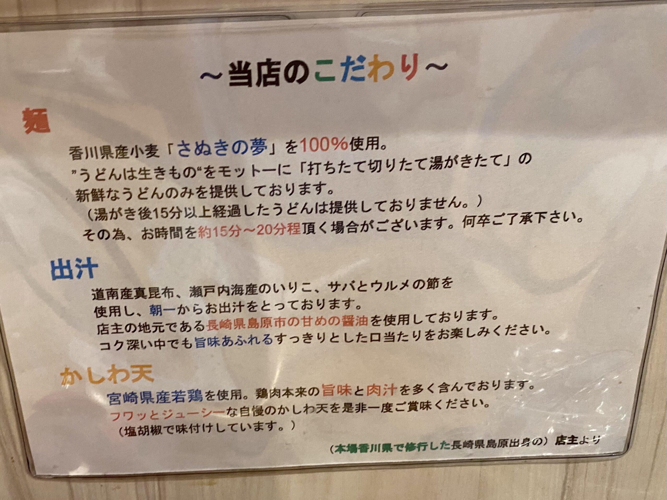 うどん、出汁、かしわ天のこだわりが書かれています。