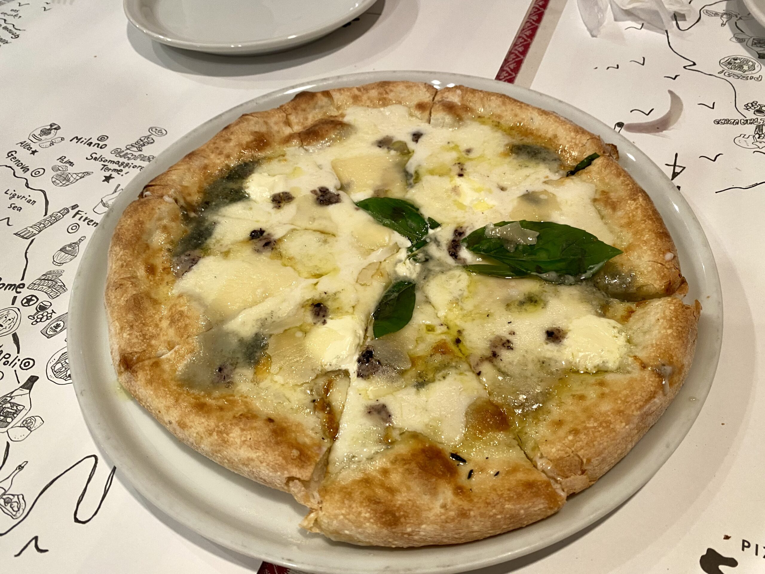 前回訪問したときにディナーコースでマルゲリータとのハーフでこのピッツァを食べて美味しさが忘れられず。今回はこのピッツァをフルに味わいたくて単品でオーダー。満喫できました。