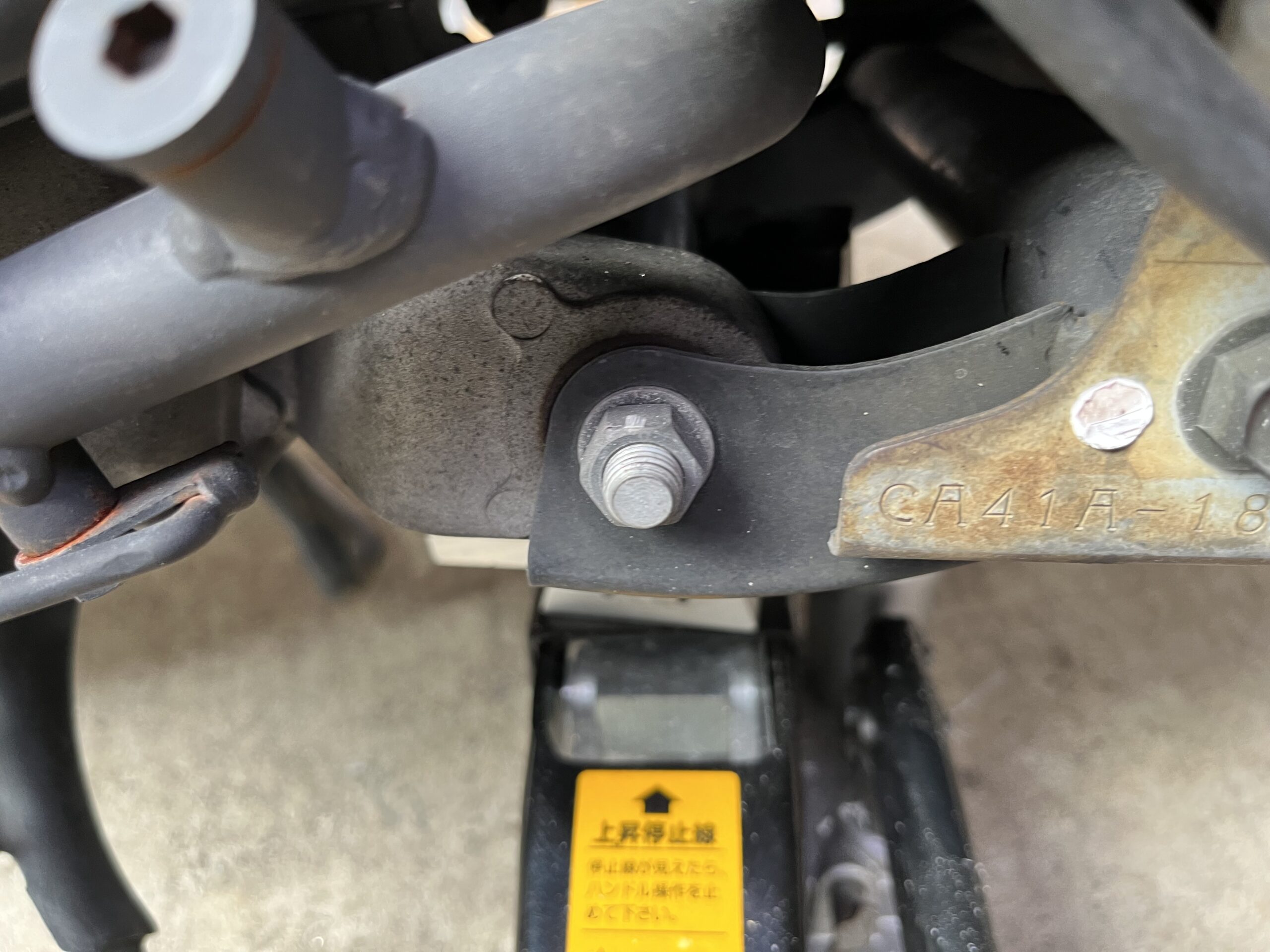今回は手持ちのマサダシザースジャッキをエンジンハンガーの横棒にあてがう感じで持ち上げましたが左右にグラグラ動くので倒れないように気をつけて、立てた状態のセンタースタンド左側がかすかに接地しているようにして。