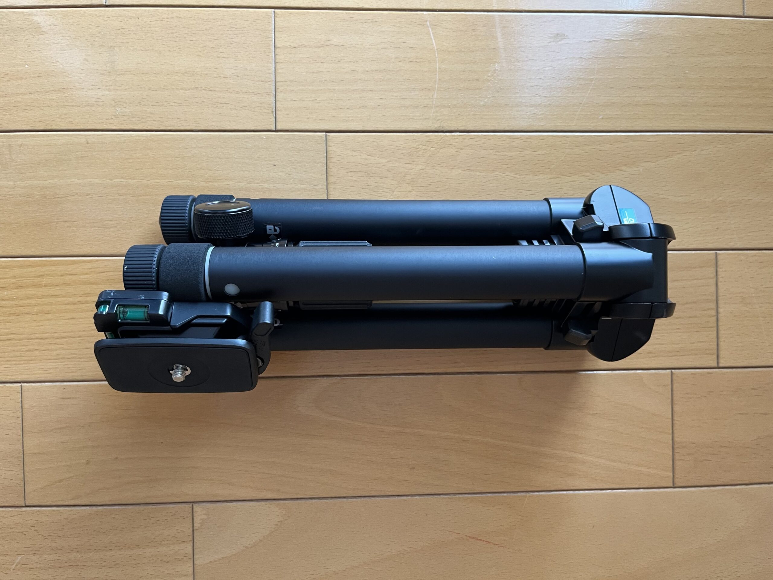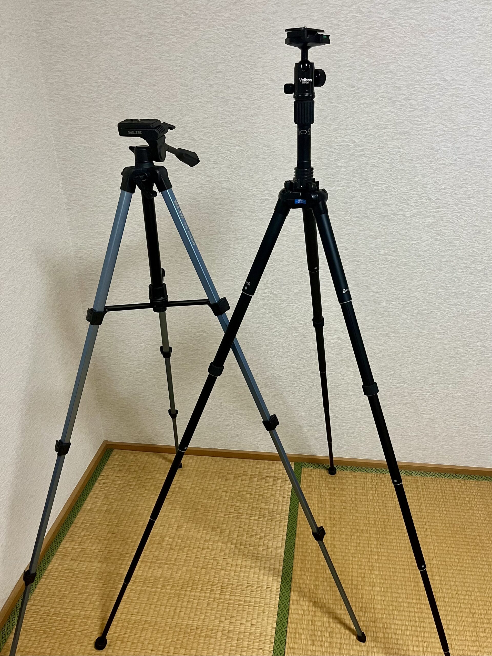 今まで使っていた,ごく一般的な三脚(SLIK GX6400 縮長470mm,全高1540mm)と比べるとこんなに違う。