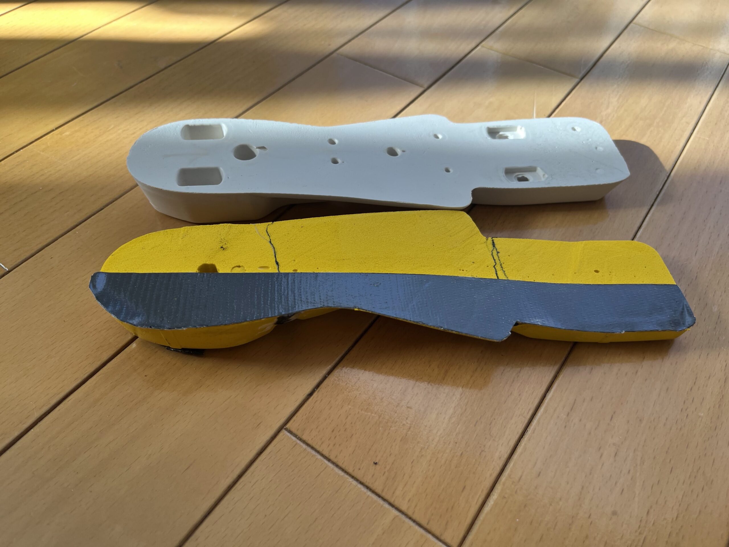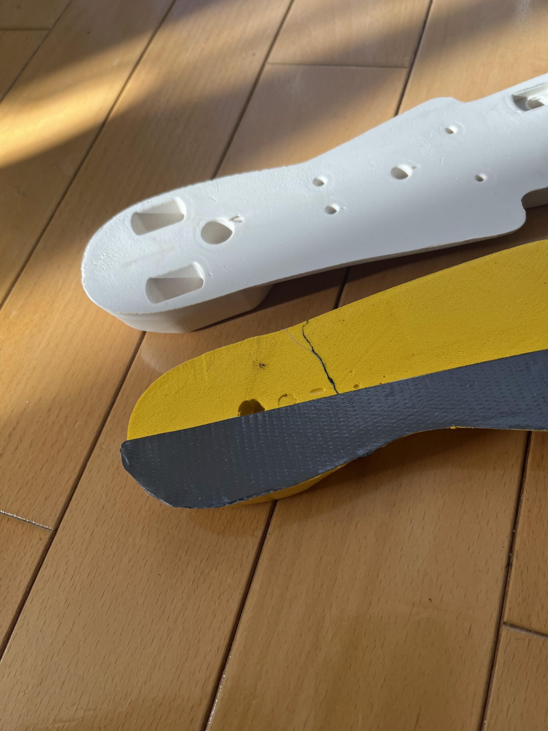 しかし,たくさん削りすぎて昨シーズン中すこし重心が後ろに下がってしまう傾向を感じたのでゼッパカカト側に1mmのゴムシートを2枚貼ってみたのです。