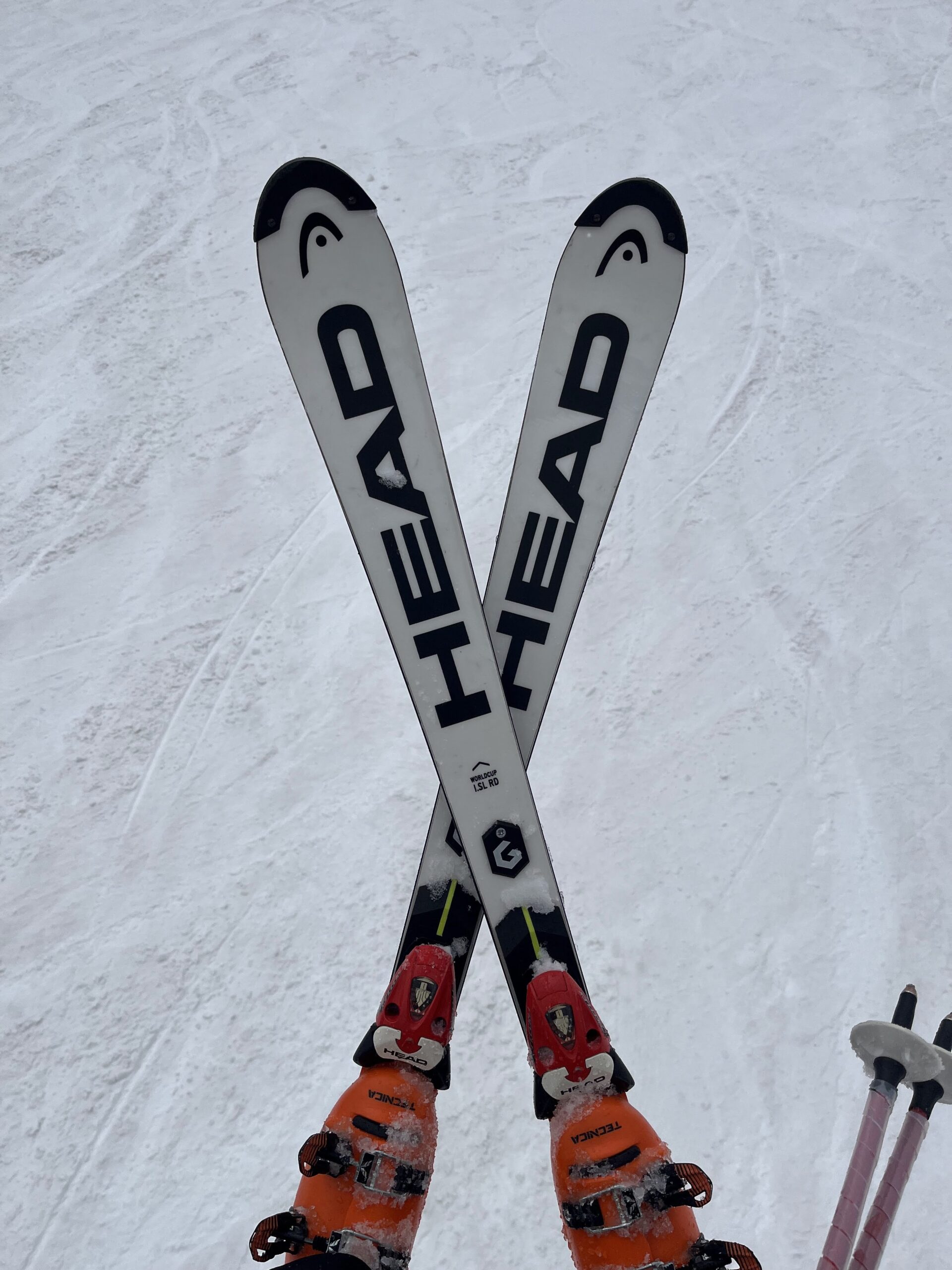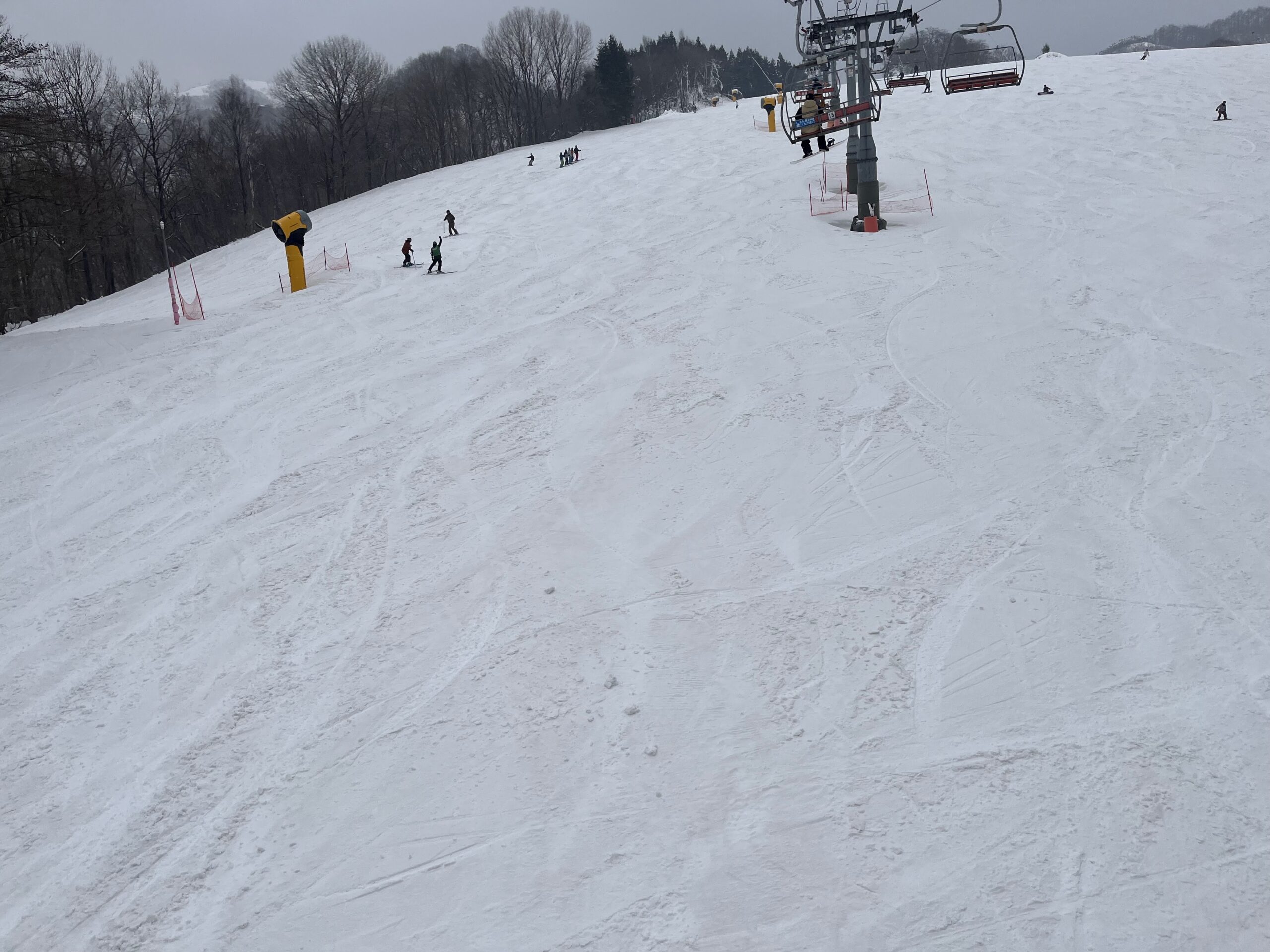 けっこう寒くて雪がチラつく天候だったのですが中央ゲレンデの雪は茶色くなっていて滑りが悪い。
