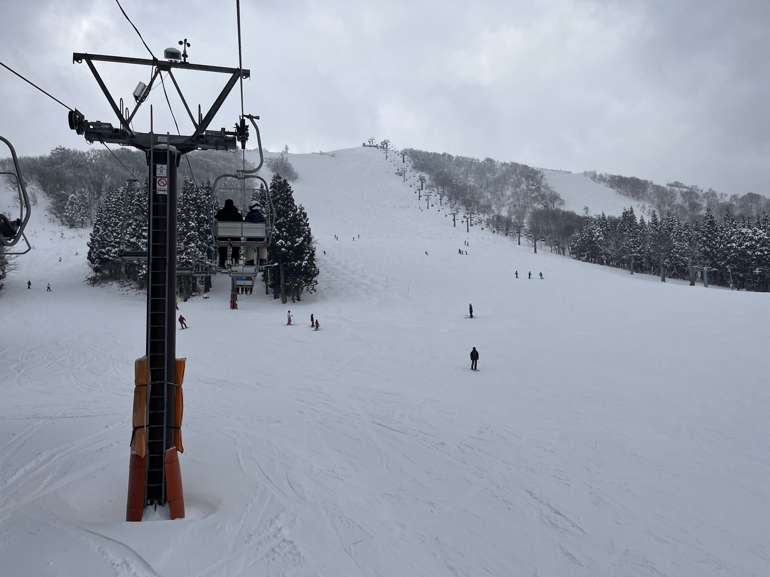 旅館街駐車場ペアリフトはスキーを履いて乗車することができましたが滑って降りること、そしてスキーを履いたままの下りリフト乗車は不可。