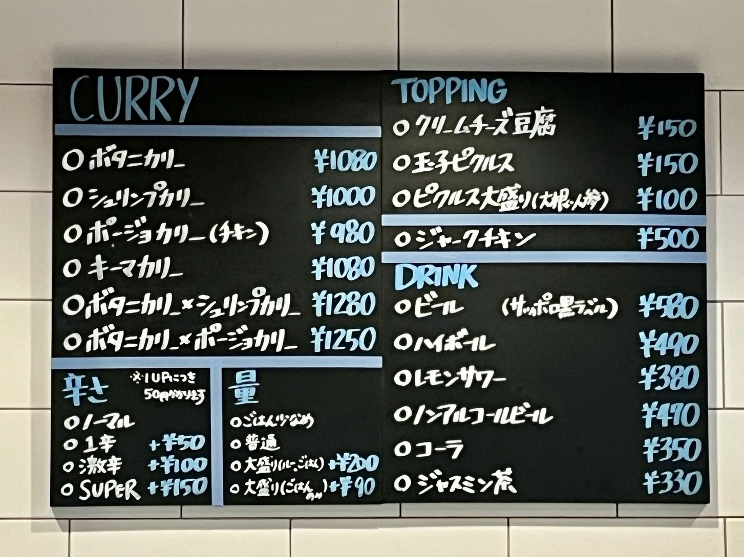 ワタクシはキーマカリーが好みなのですが、そういえば看板メニューの「ボタニカリー」を食べたことがない(合がけはあります)ことに今更ながら気がついたので、ボタニカリー(1080円)をルーとご飯大盛り(200円)1辛(50円)で注文。