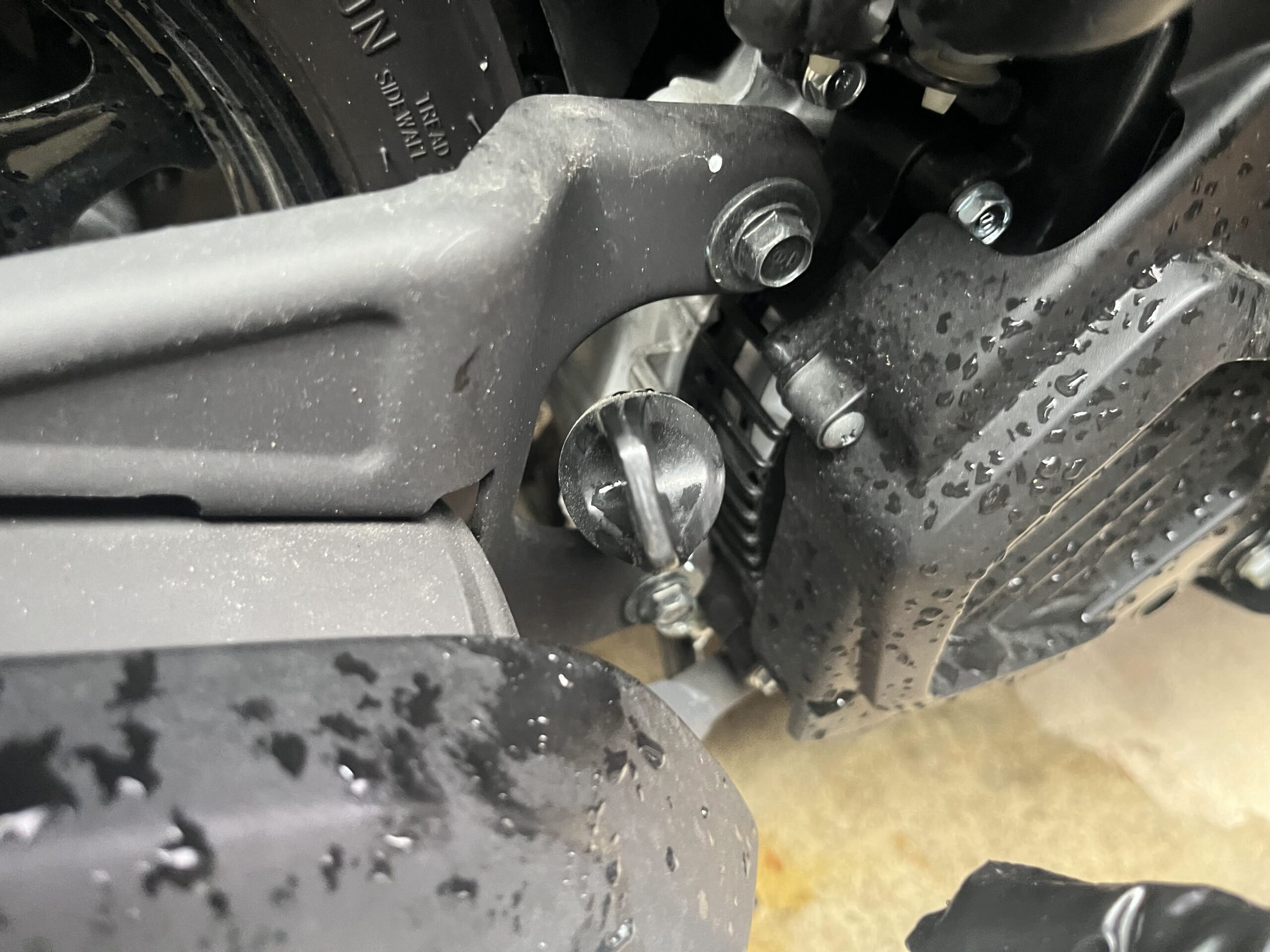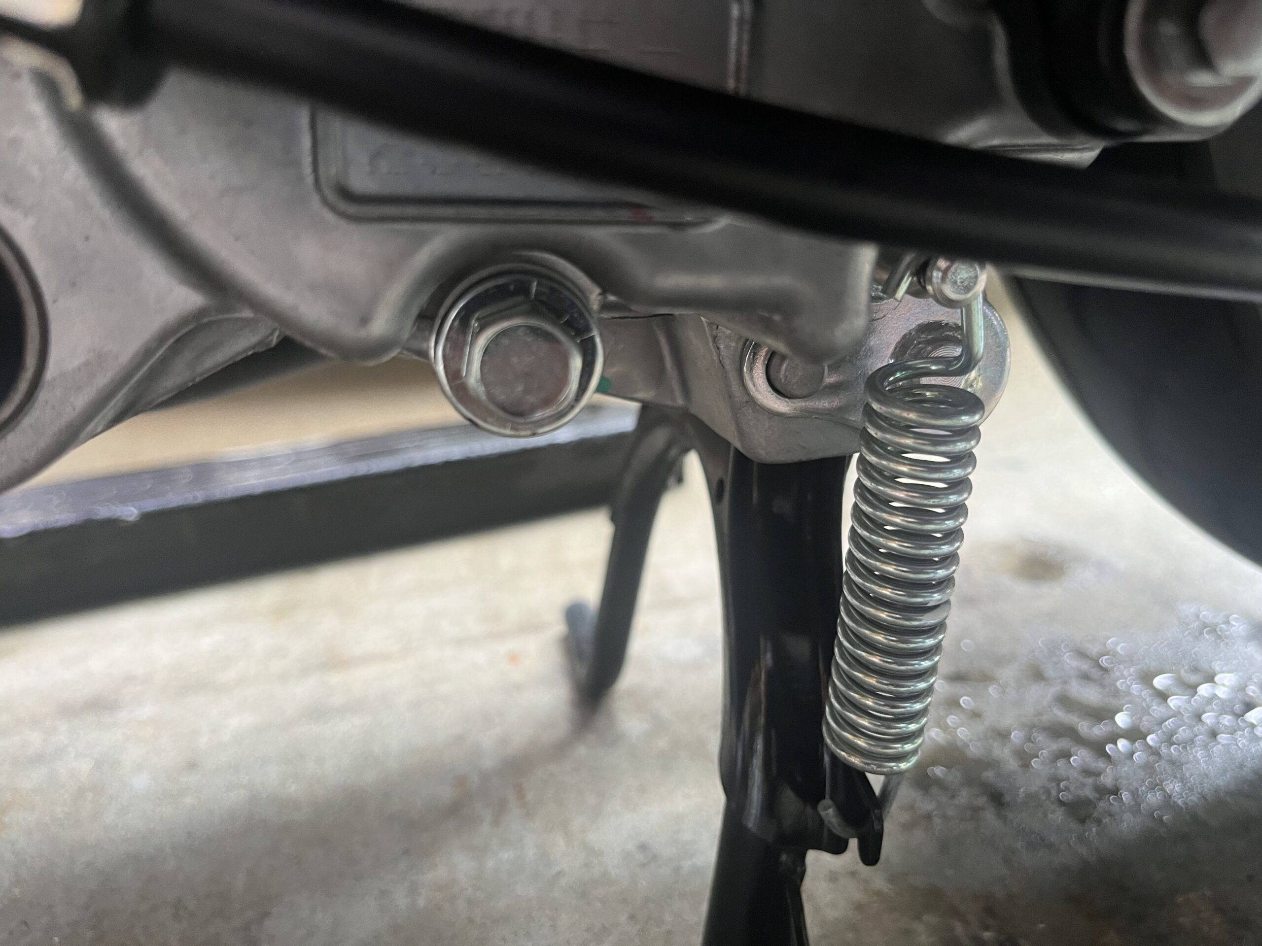ドレンボルトは車体左側の,スタンド前方にあります。使用工具のサイズ12mm。