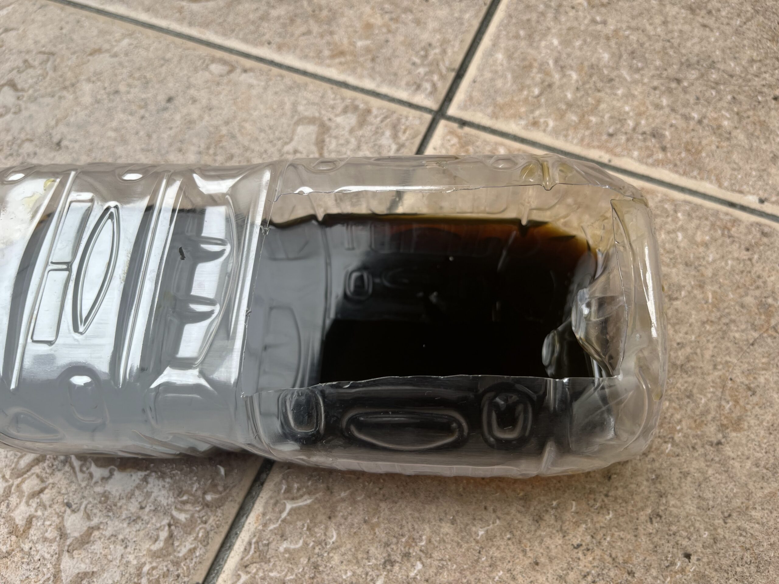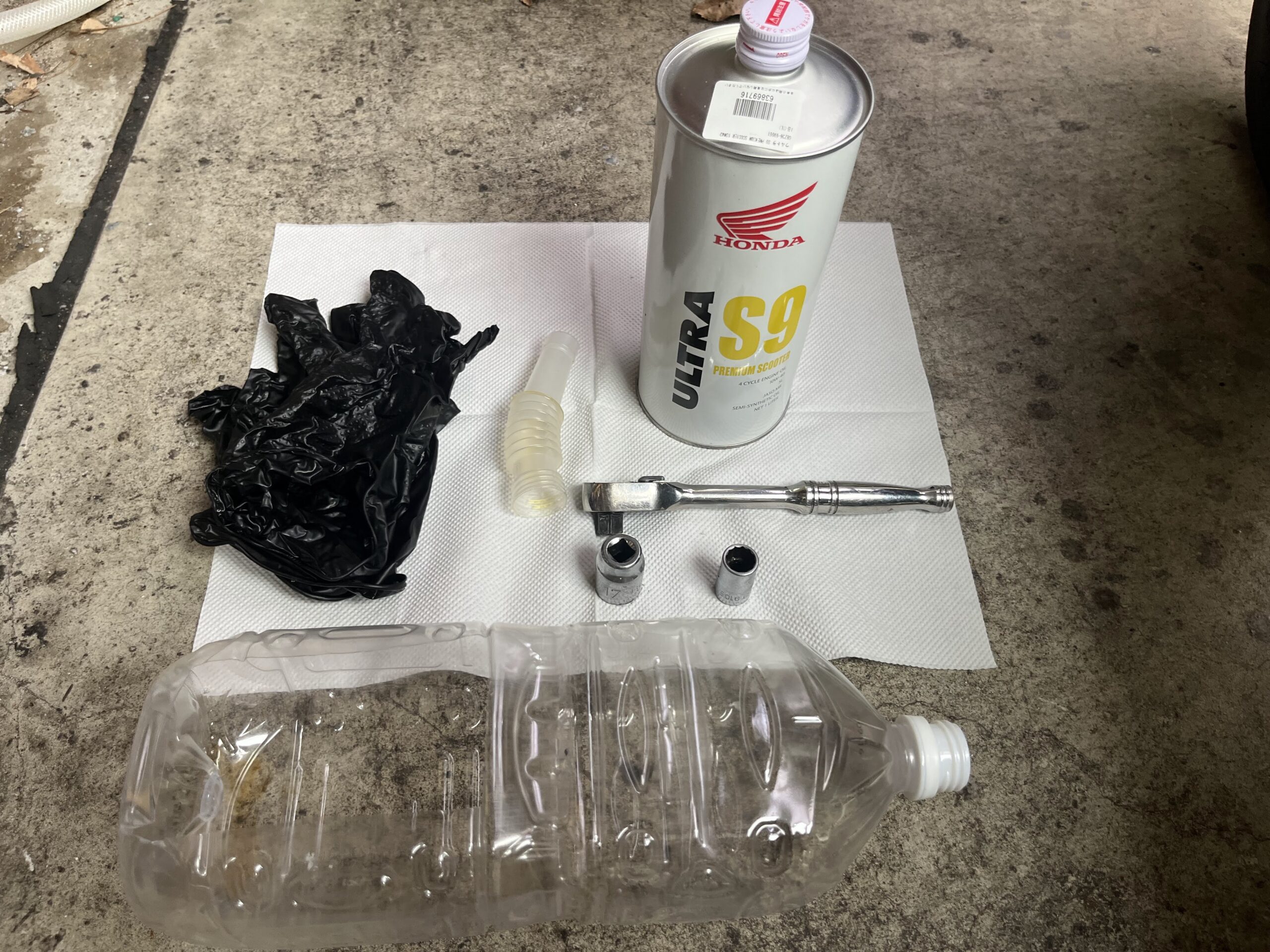 ドレンボルトとセンタースタンドの位置が近いので,オイル受け(2リットルのペットボトルをカットしたものを使用)を置いた状態ではうまくいかないので片手でオイルが落ちてくる位置に支えてあげる必要あり。