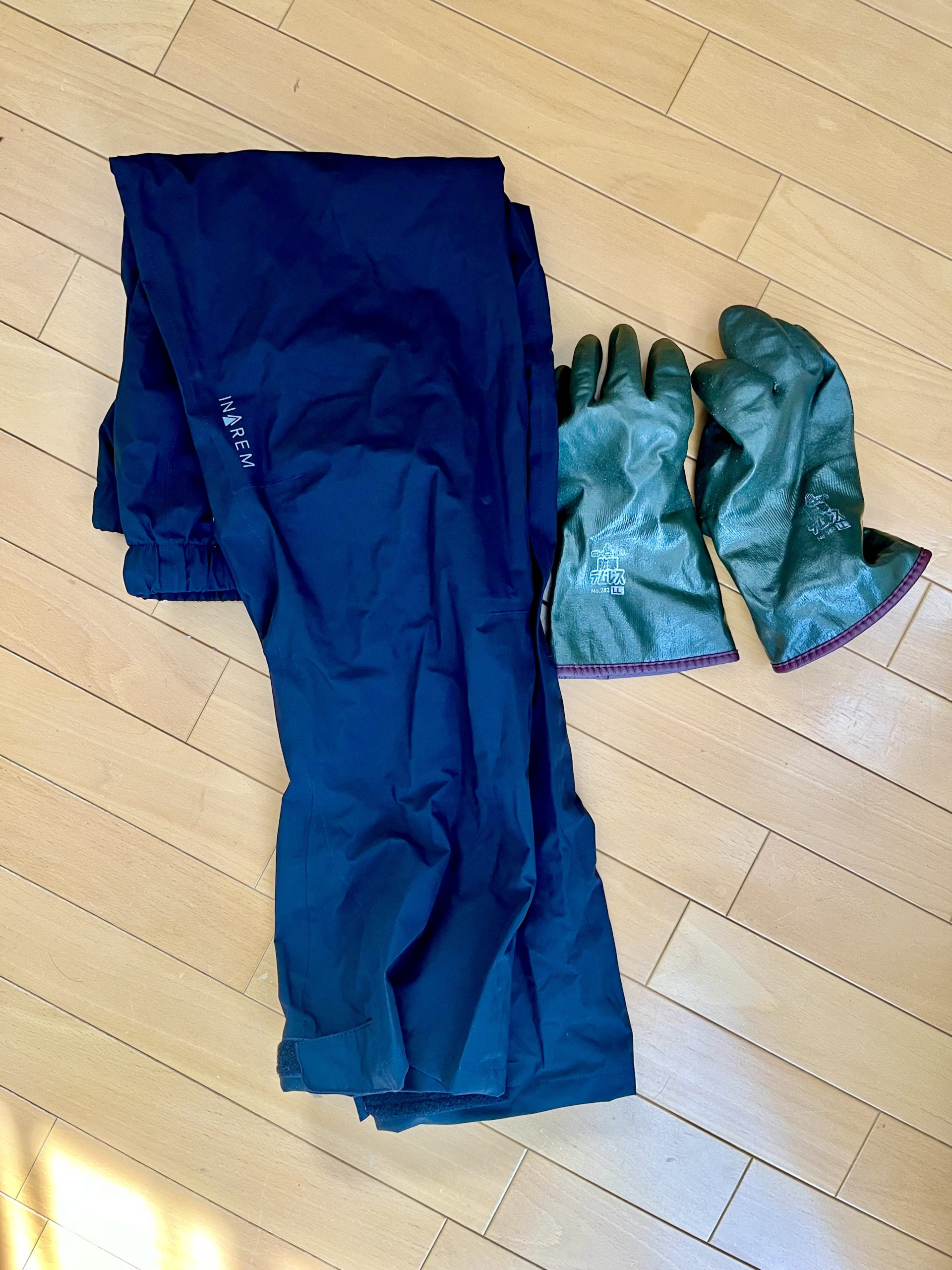 さらに雨の日の装備,レインパンツとゴム手袋も点検。