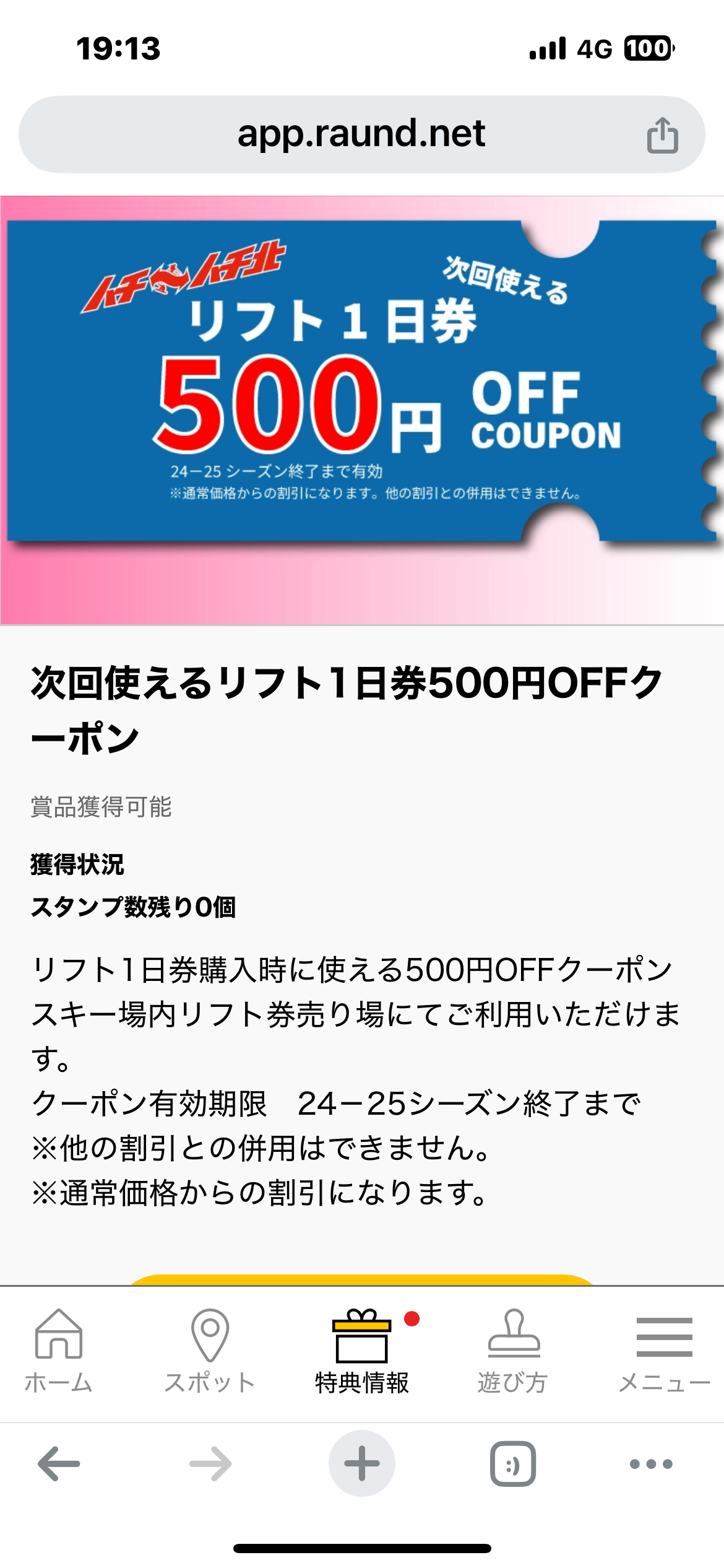 特典はデジタルスタンプ3つでリフト1日券の500円割引券。