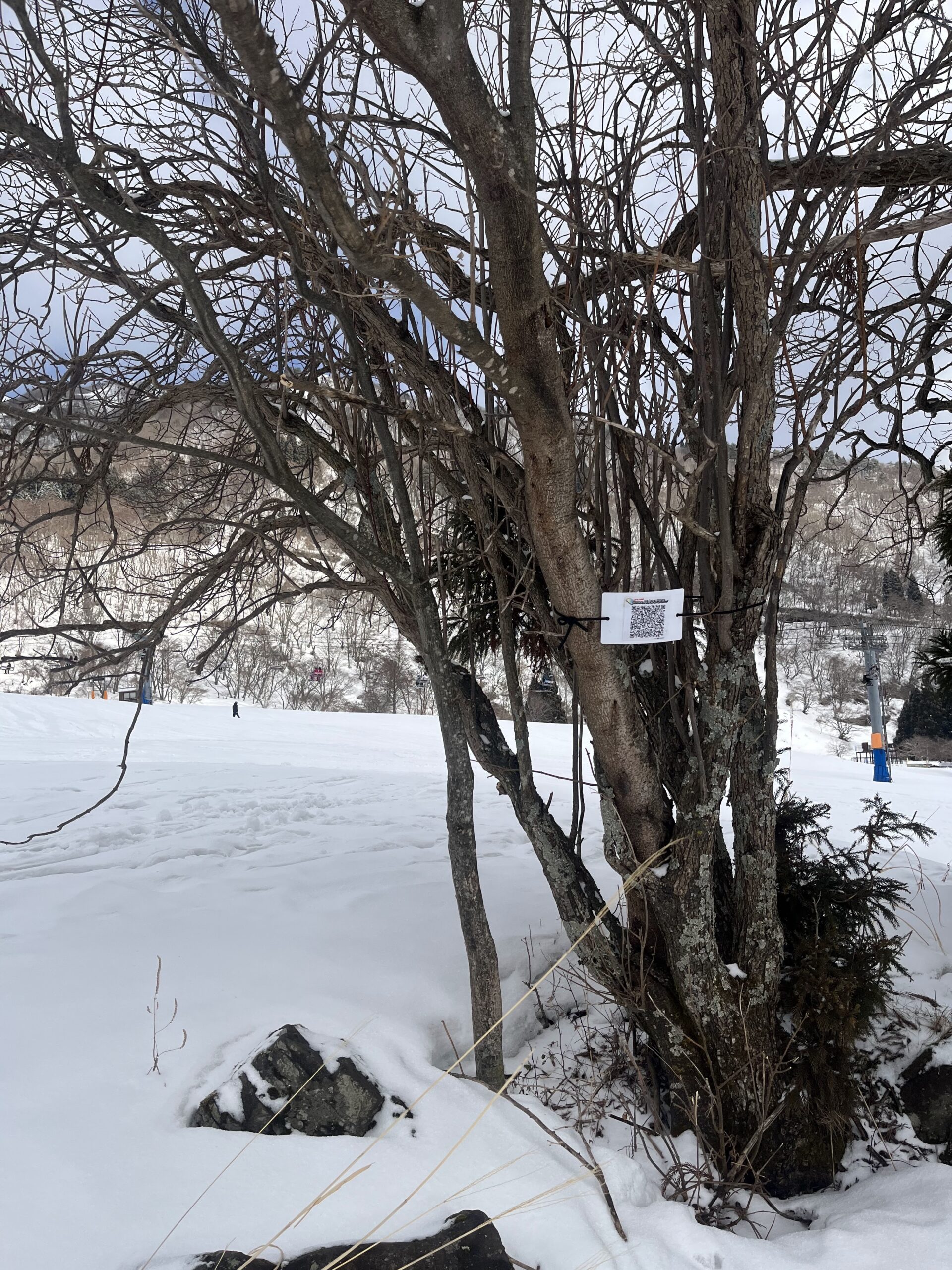 ハチ高原に移動して,中央ゲレンデのトリプルリフトとペアリフトのあいだにある木にQRコードがあるので読み込み。