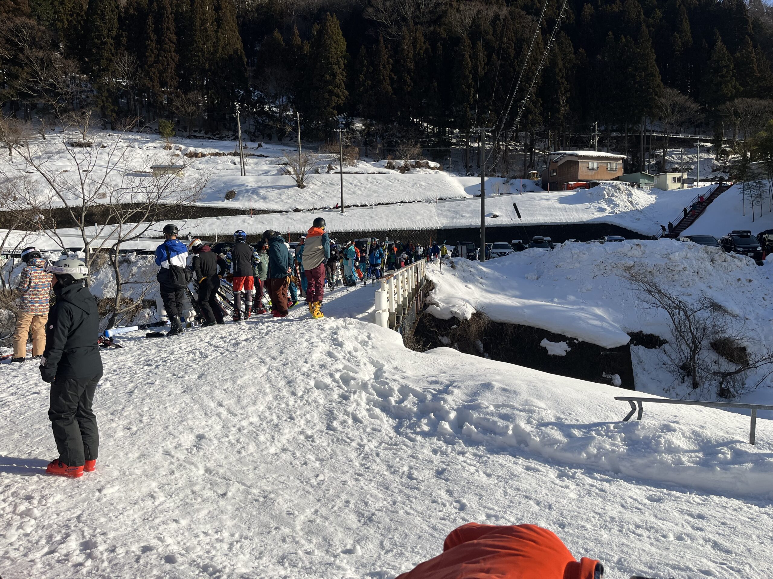 朝は登行リフト乗車するのにかなり行列ができるので早めに並びましたが,気がつくと列が伸びて橋を越え駐車場まで。