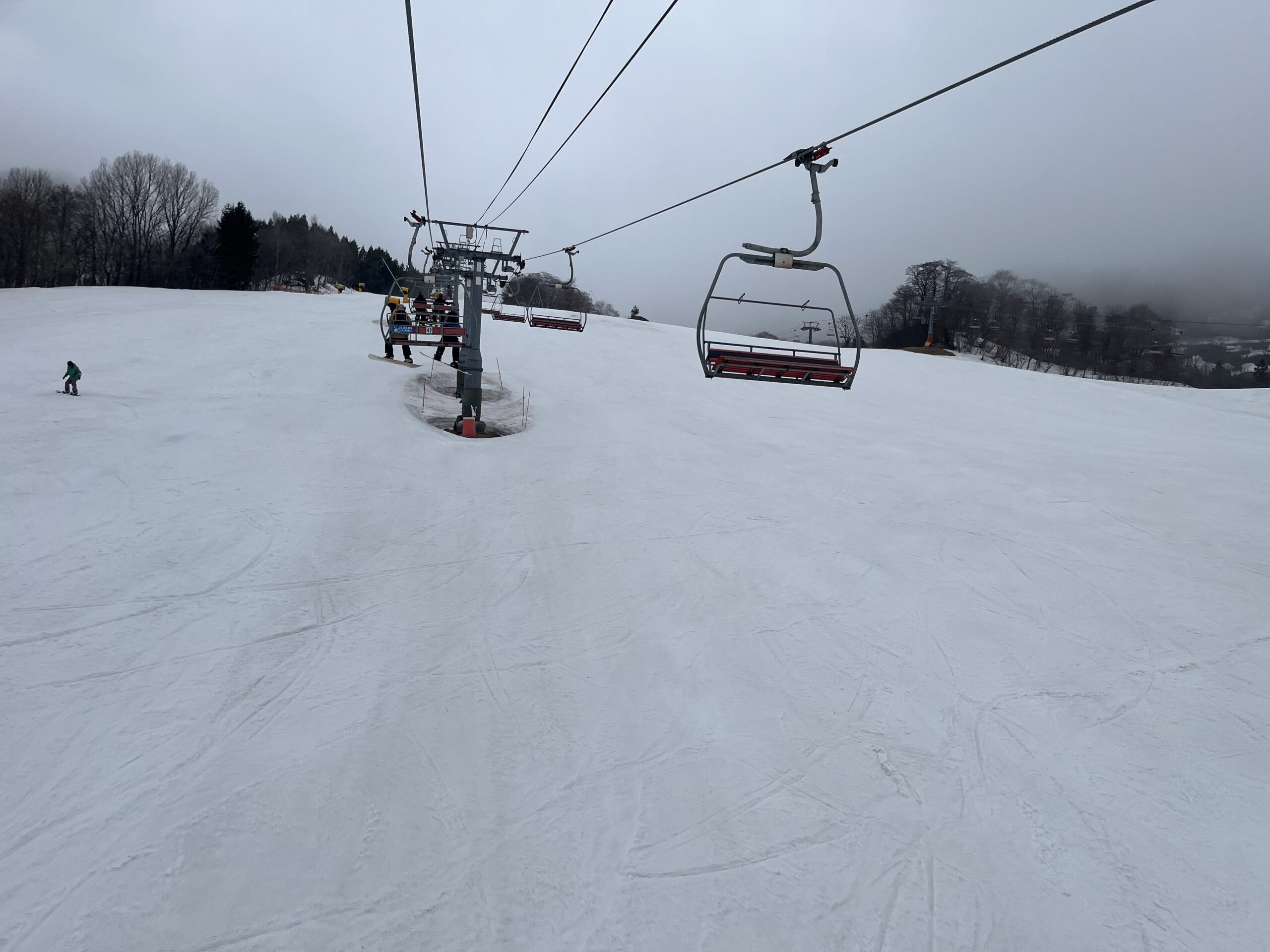 曇り空ですが,ゲレンデの上部にはかなり濃いめの霧がかかっています。