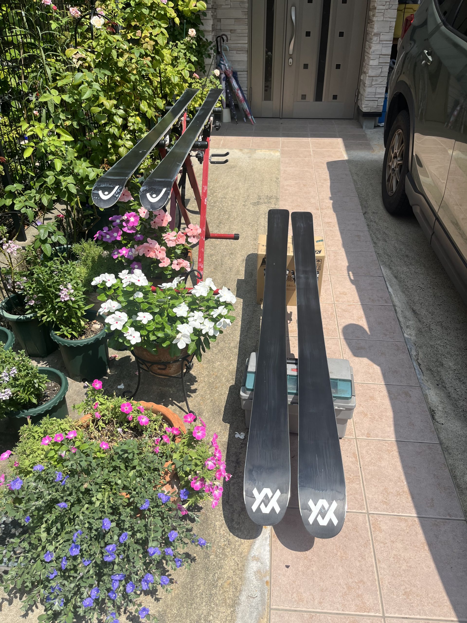 日陰=カーポートの下でスキーを冷ましていたら急な雨が降ってきましたがタイミングよく難を逃れることができました。