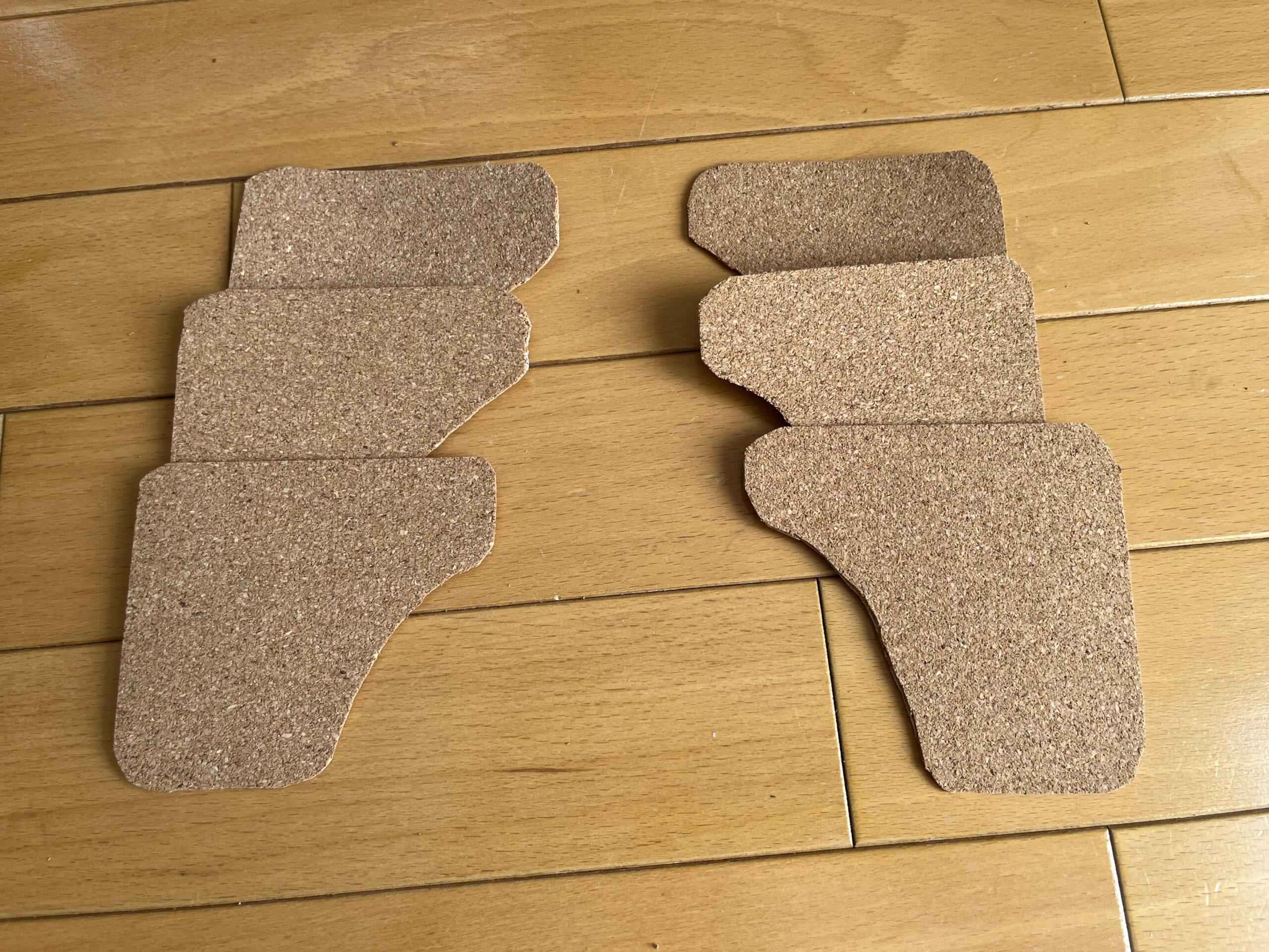 2ミリ厚のコルクシートを左右3枚づつ貼り付けることにしました。
