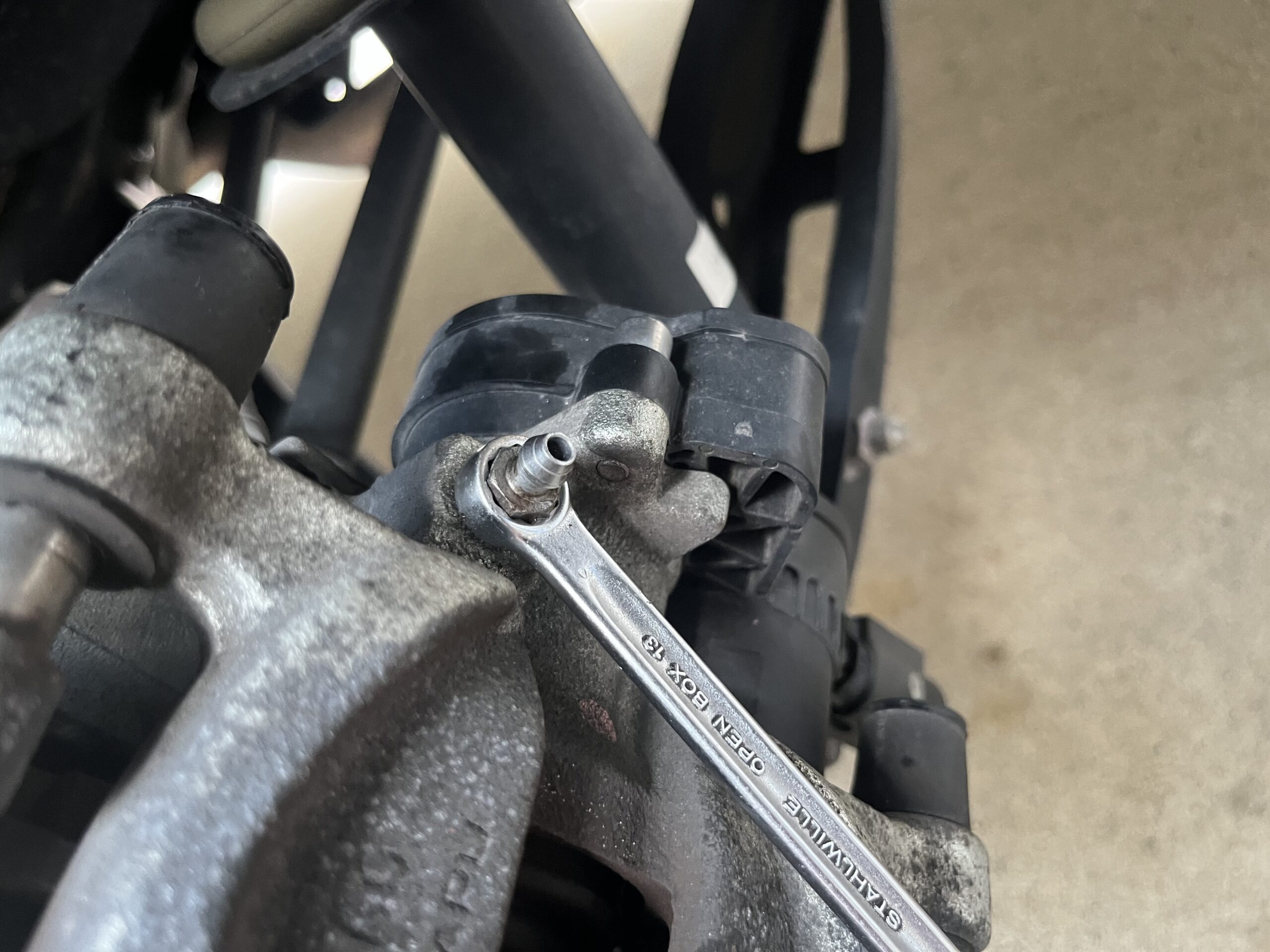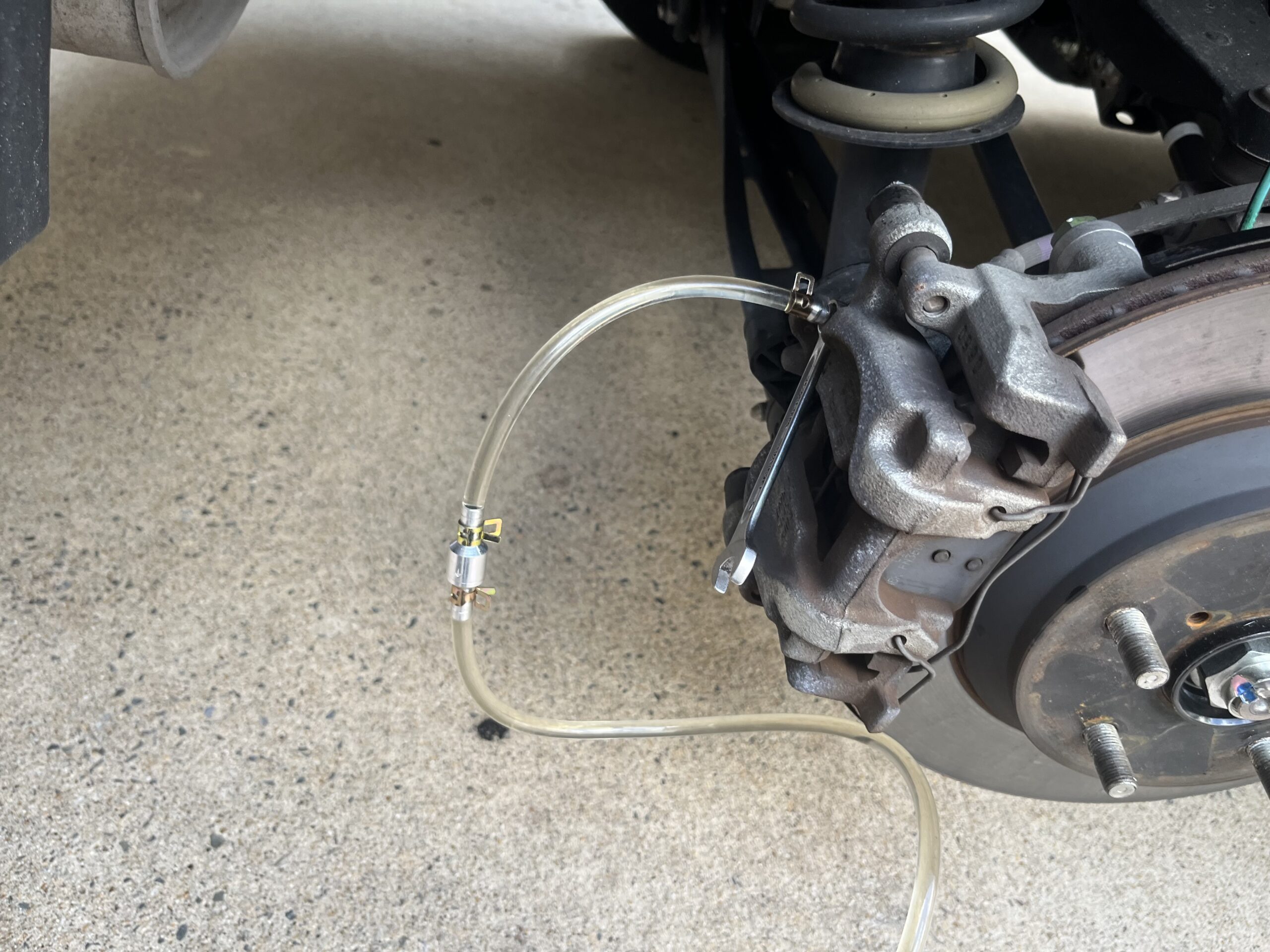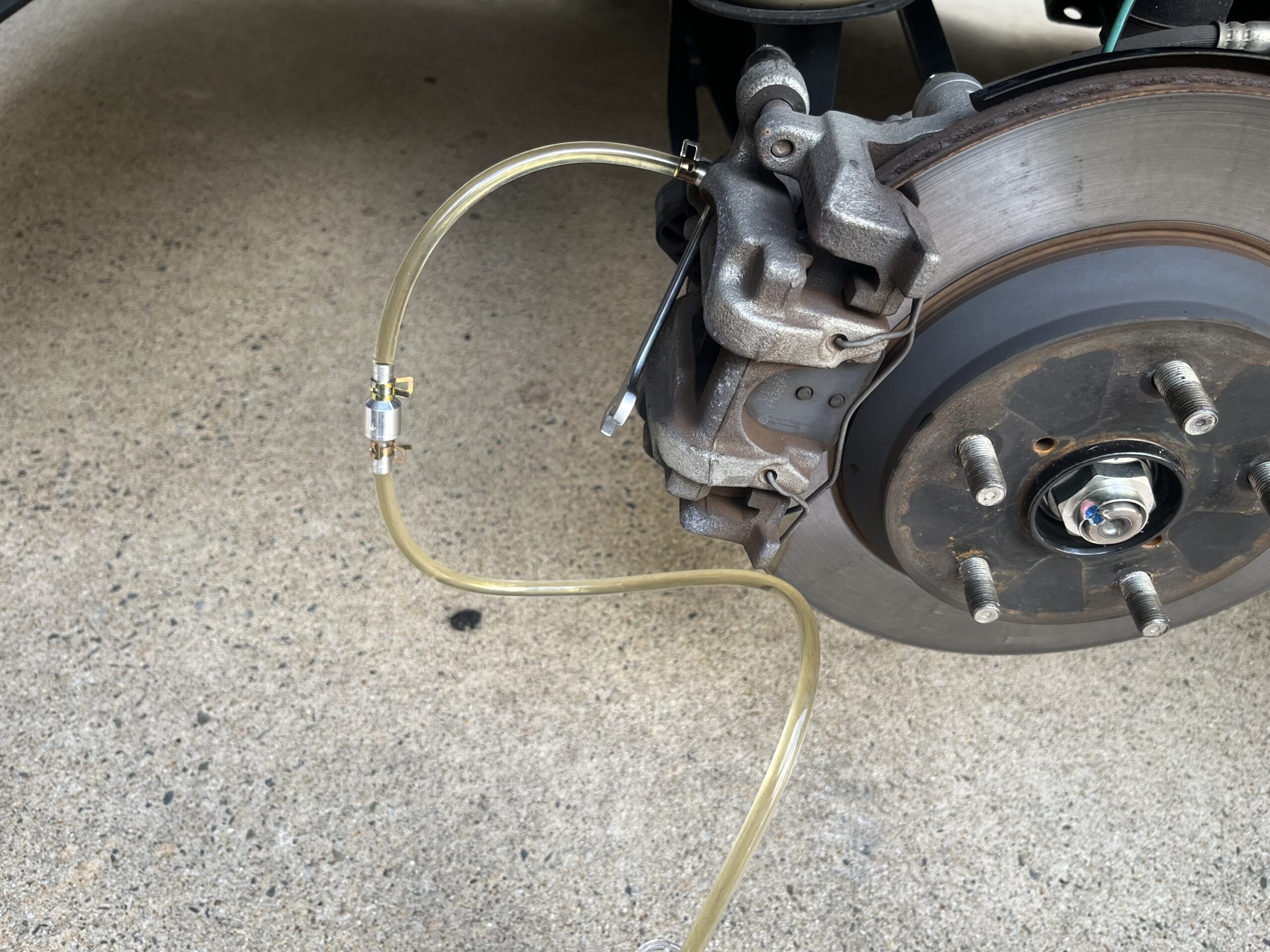 ワンウェイバルブを繋げたホースをブリーダーボルトに接続し、ブリーダーボルトを緩めてブレーキペダルを数回ストロークさせると新しいブレーキフルードに入れ替わります。