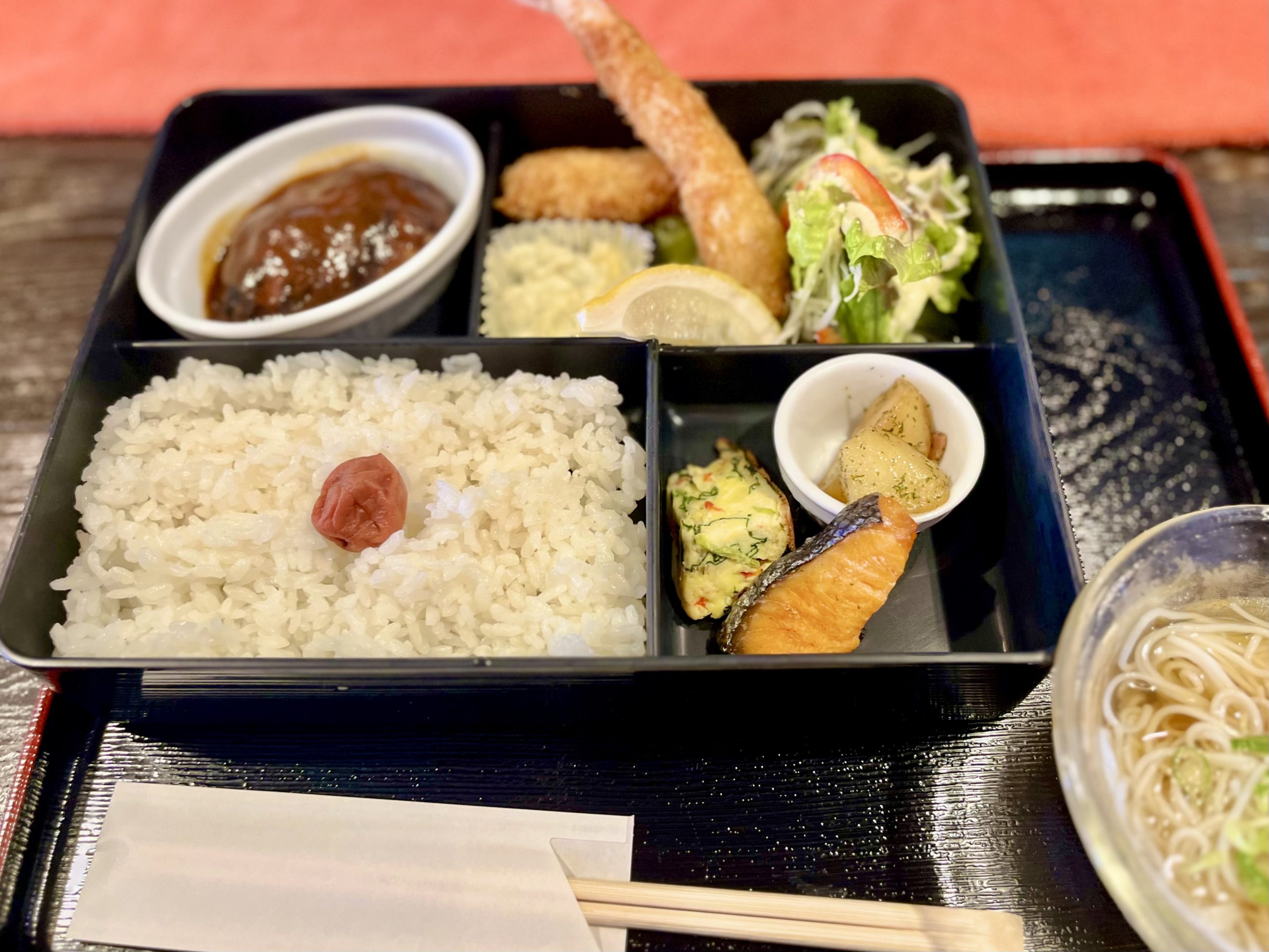 サービスランチも悪くなさそうですが,初めてなので王道のハンバーグとエビフライ,クリームコロッケが味わえる洋食弁当にしようと心に決めて入店。
