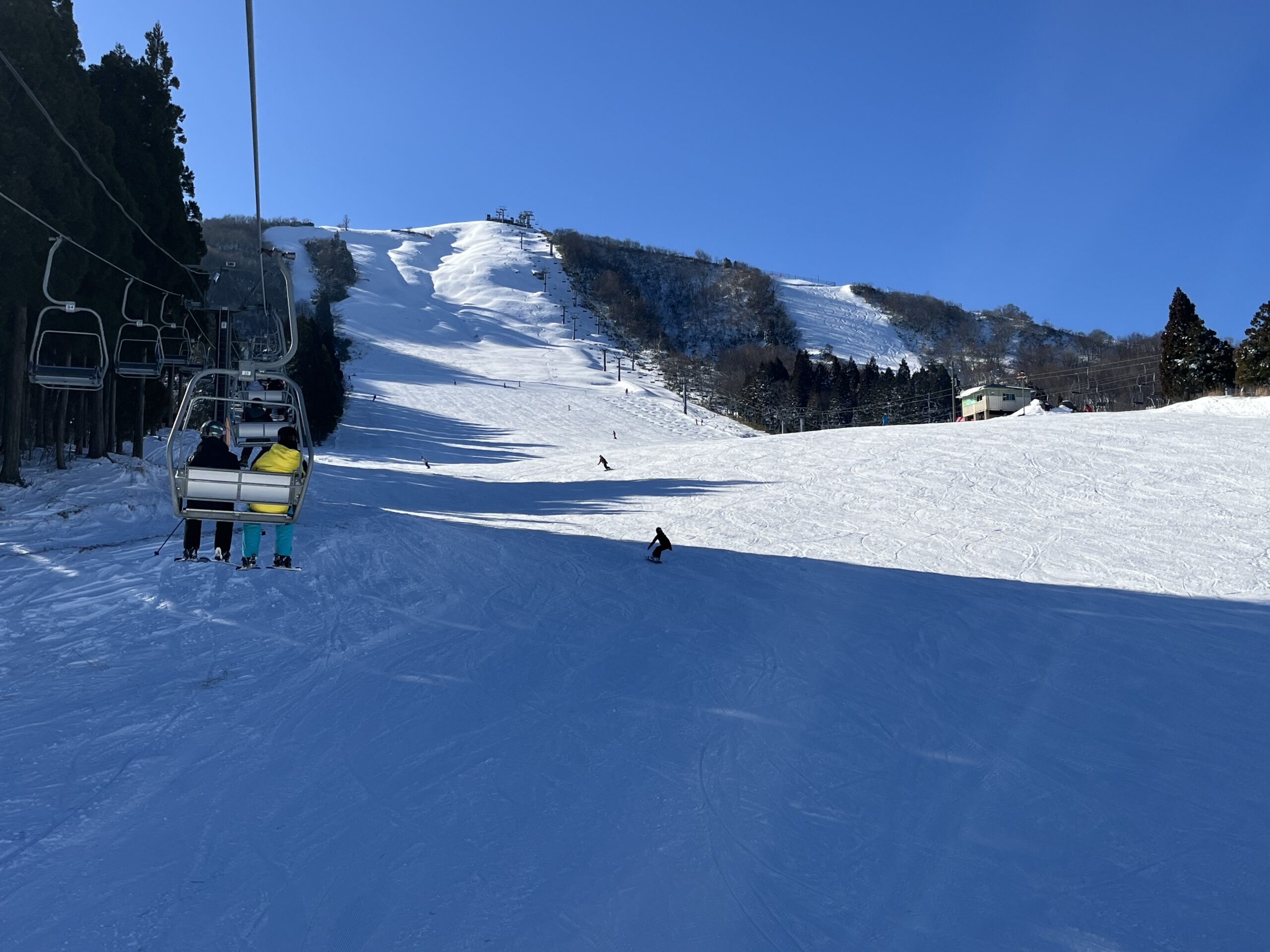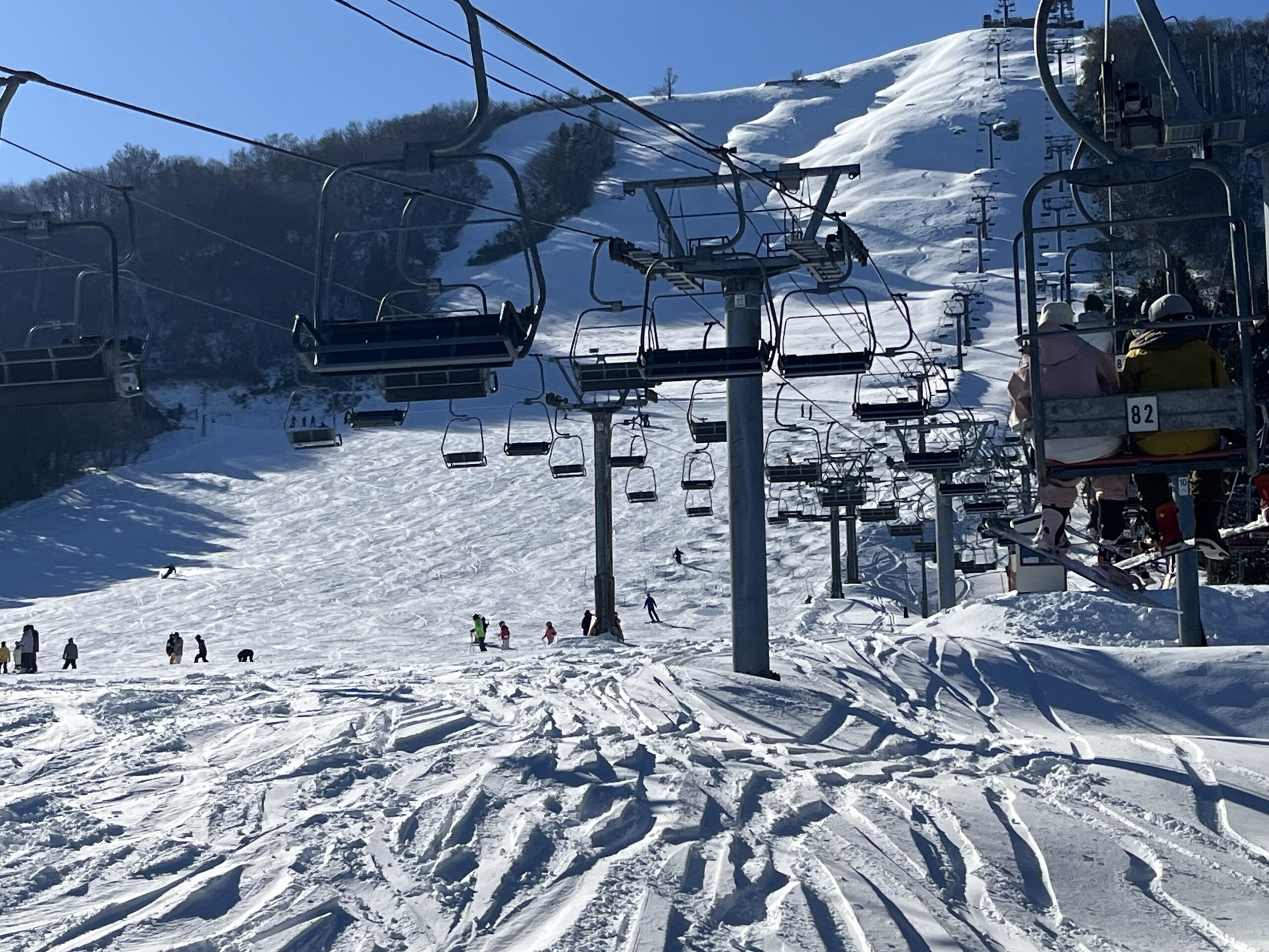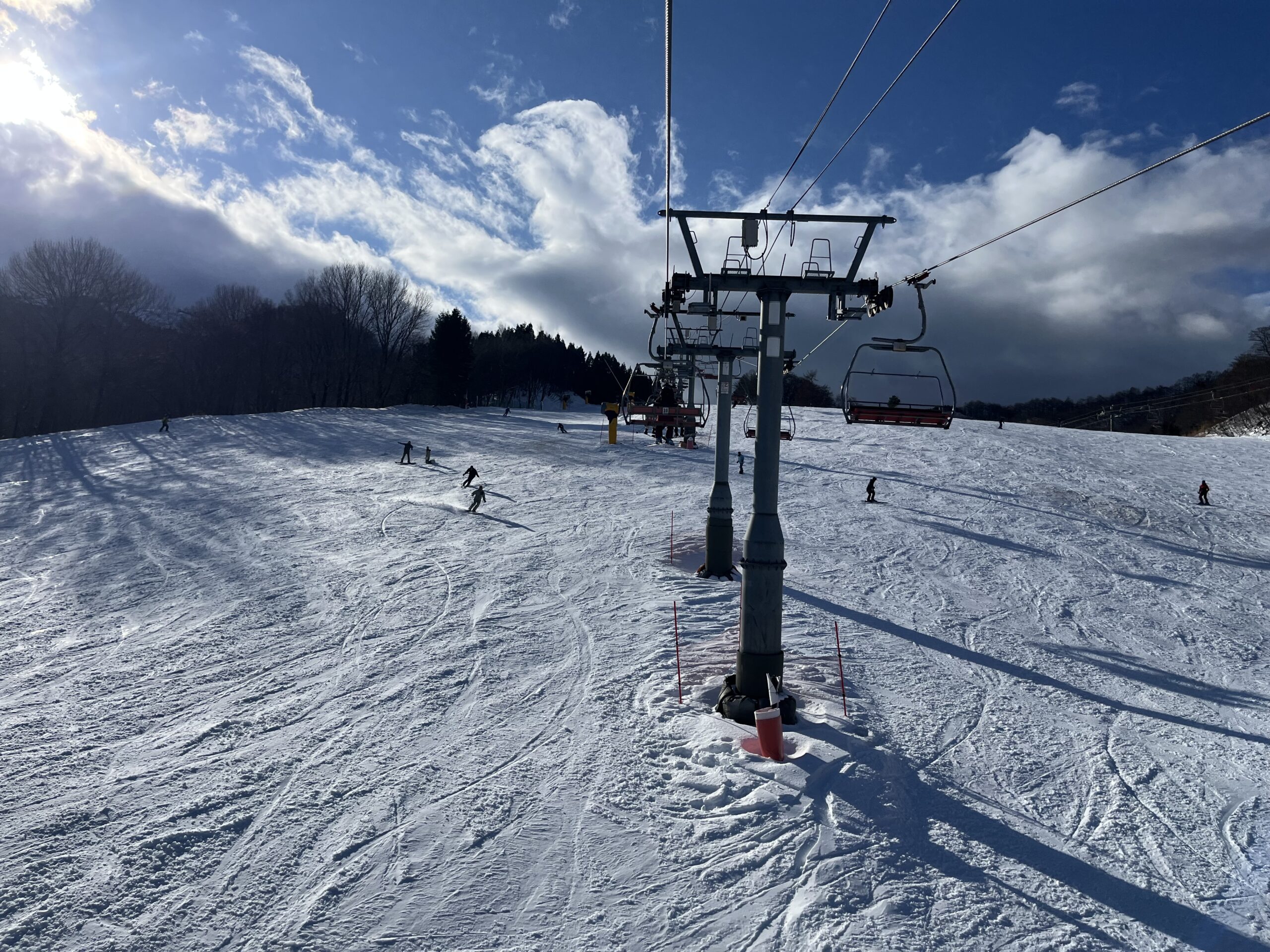 ゲレンデ駐車場から上部に登るファミリーリフトの運行開始とともに乗り込み,中央ゲレンデへ。