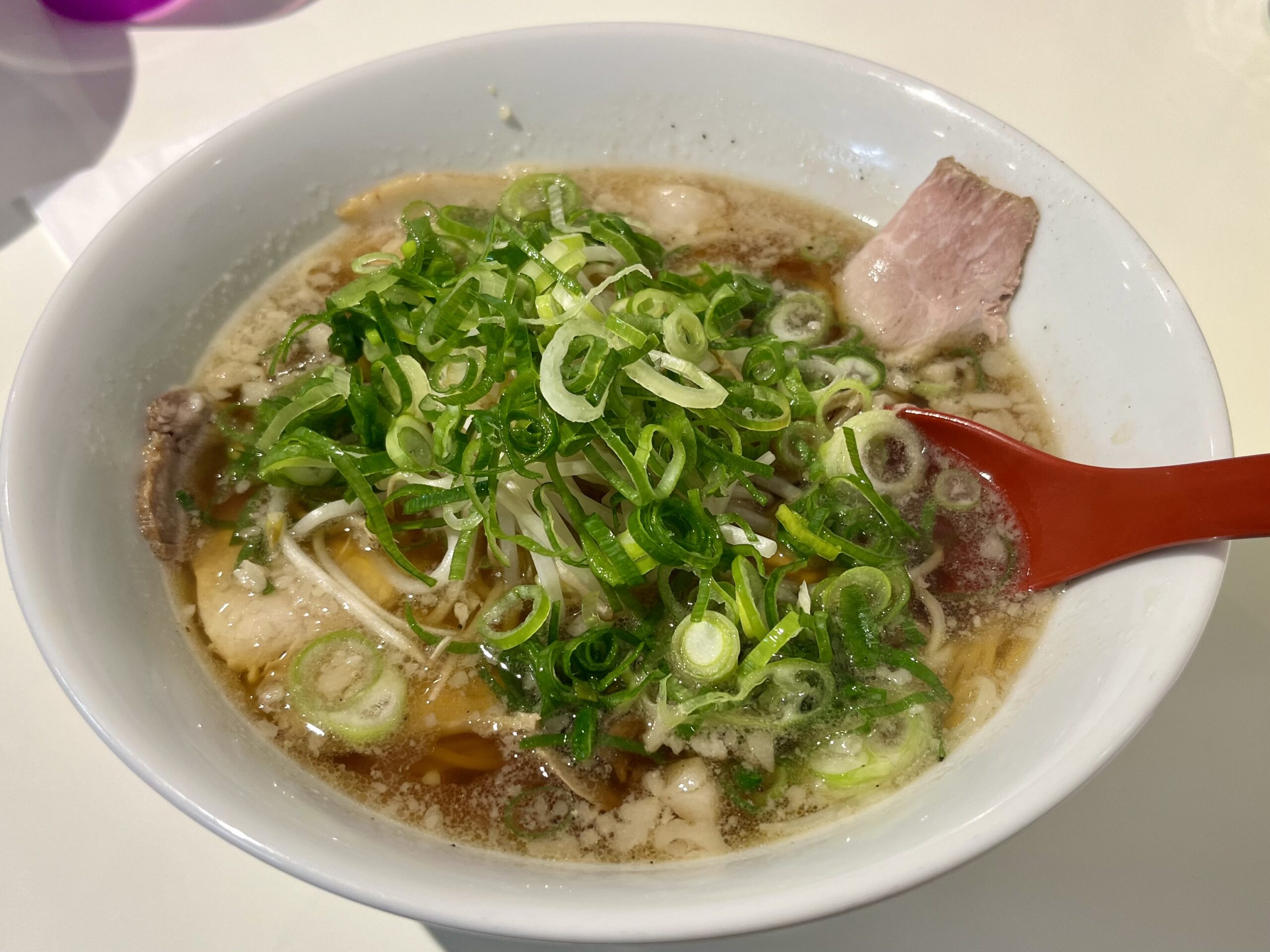 ラーメンはいつものとおりでスッキリした醤油スープに背脂で程よいコクが加わり、シャキシャキのもやしや九条ネギがよりラーメンを美味しく食べさせてくれる。