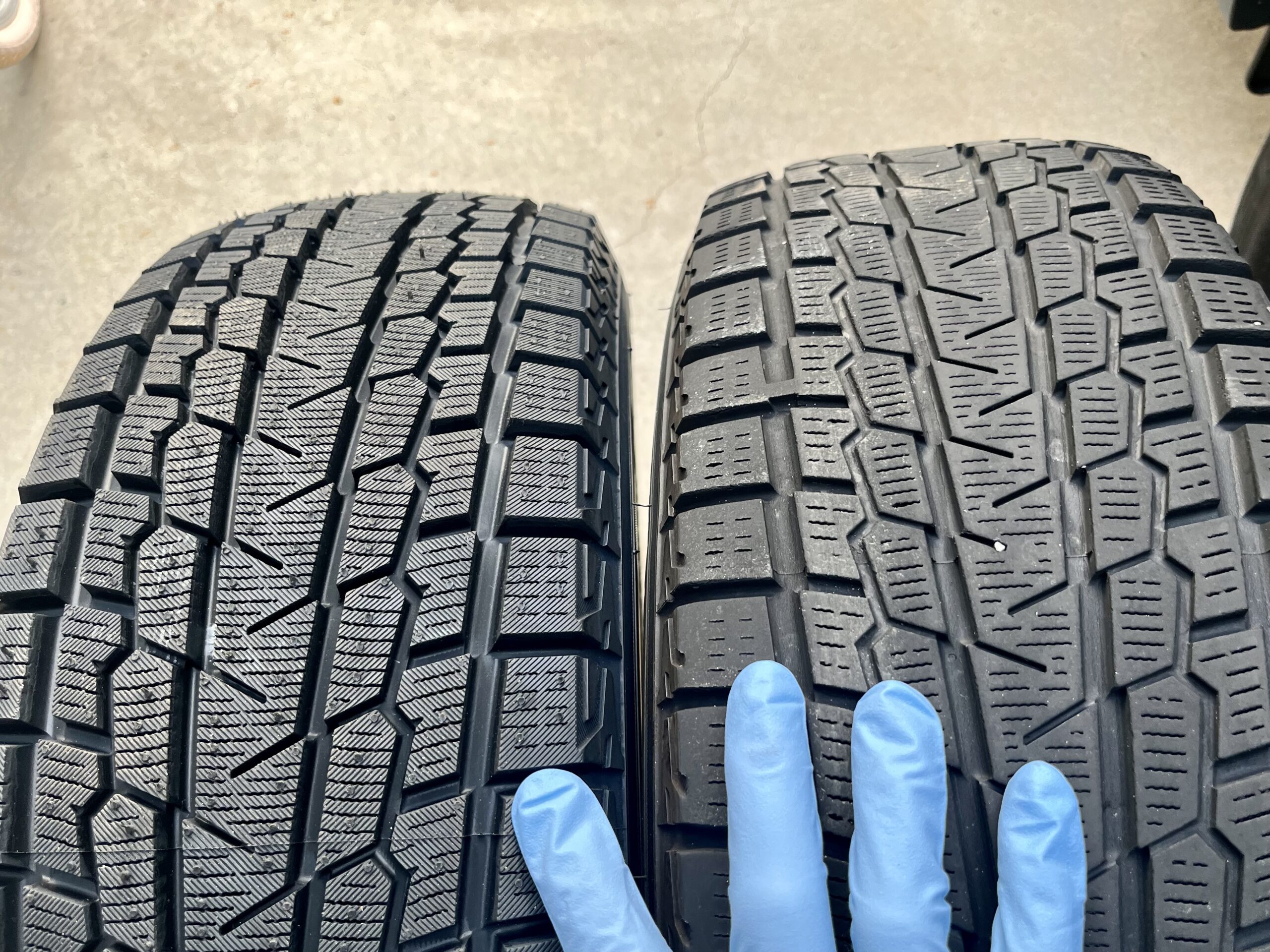 新旧のスタッドレスタイヤ、まったく同じものなので擦り減り具合が良くわかります。