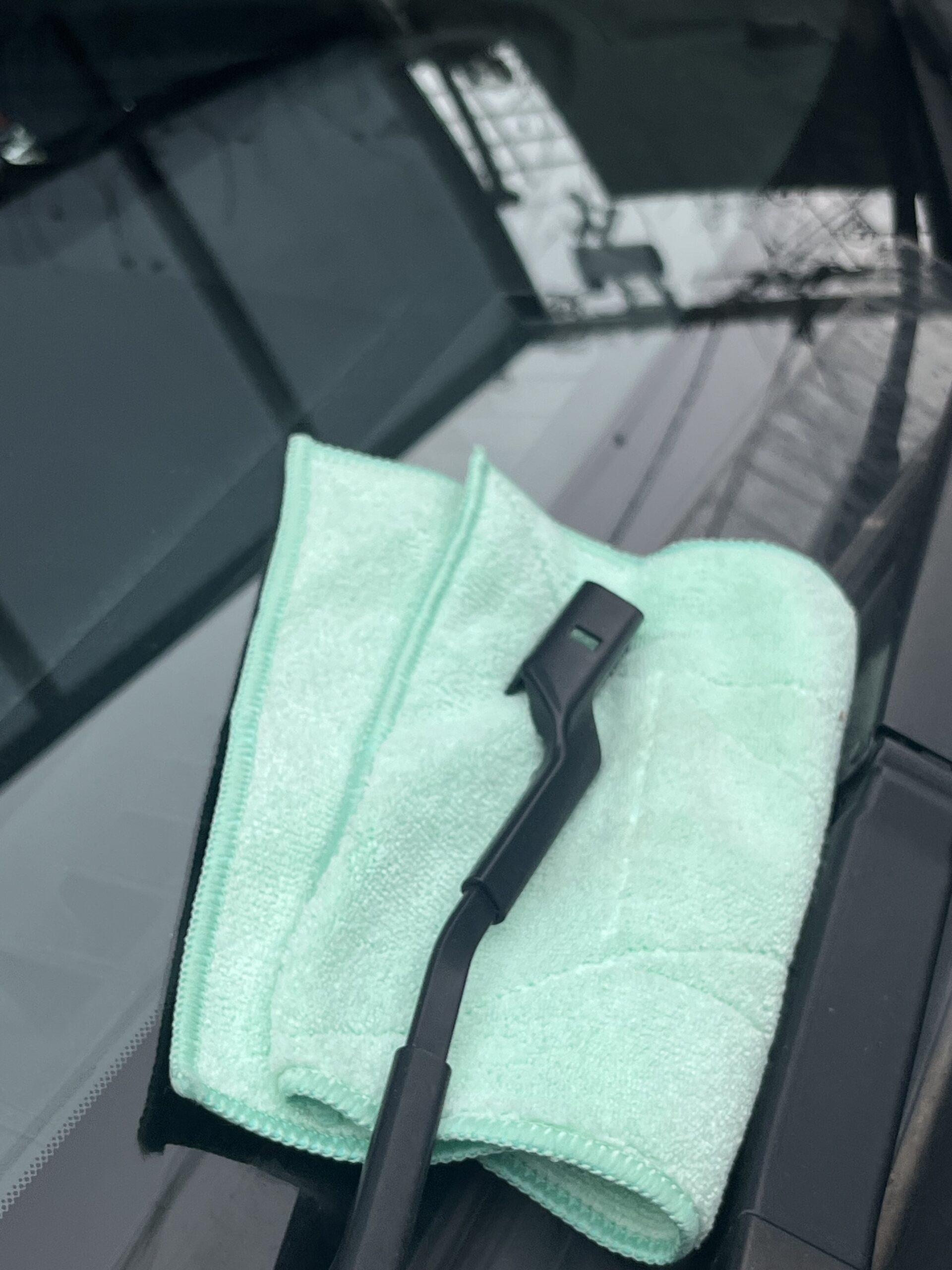 取り外したワイパーアームの先端が倒れてガラスを割ってしまうのを防止するために雑巾を敷いた上にそっと倒しておきます。