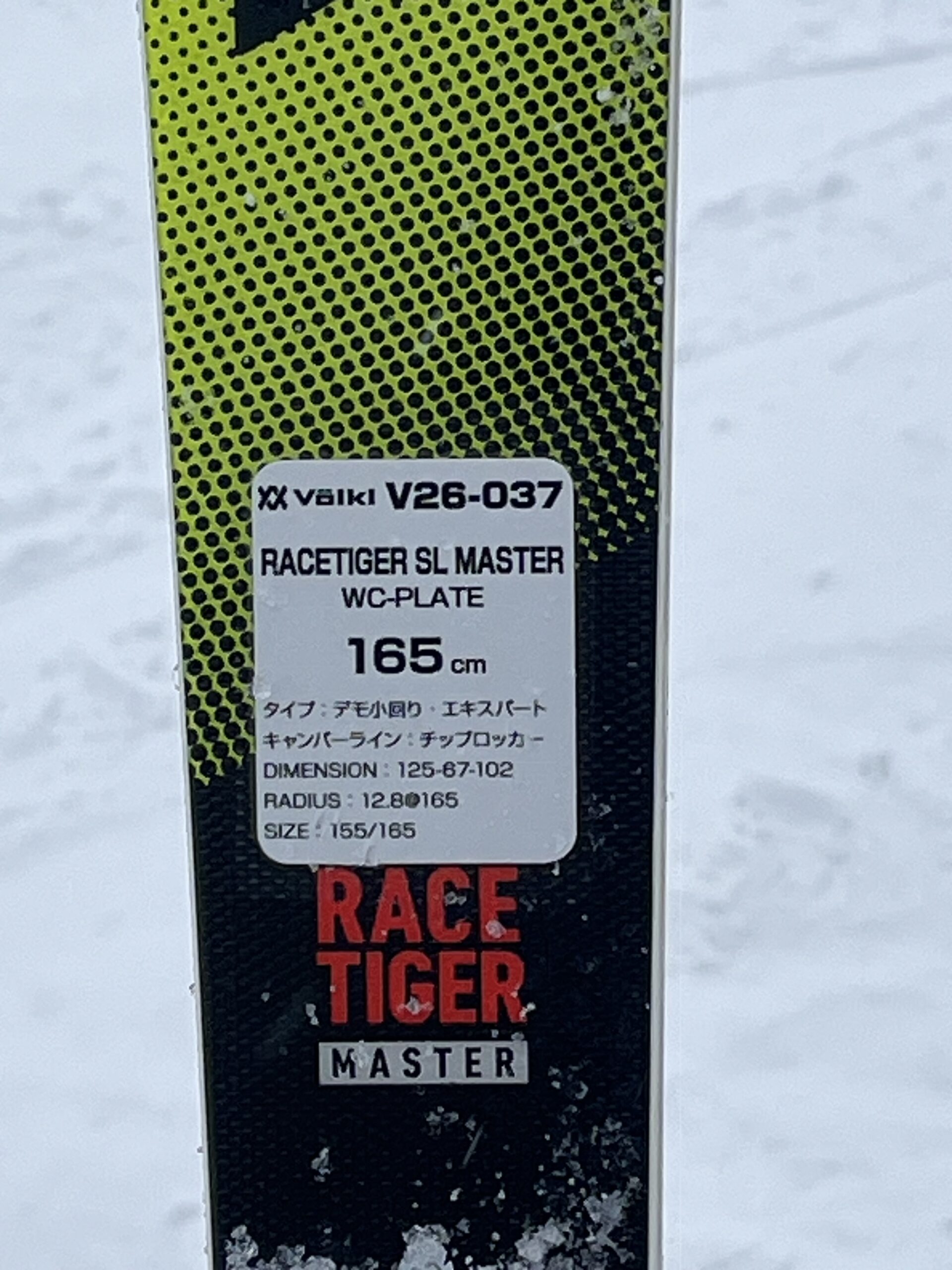 スキーに貼られたデータによるとトップ/センター/テールのサイズが125mm/67mm/102mmとなっていて、昨年も同じ金型のはずのRACETIGER SL MASTERとRACETIGER SLでトップの幅が1mm違っていたりしましたがおそらく誤差の範囲でしょう。