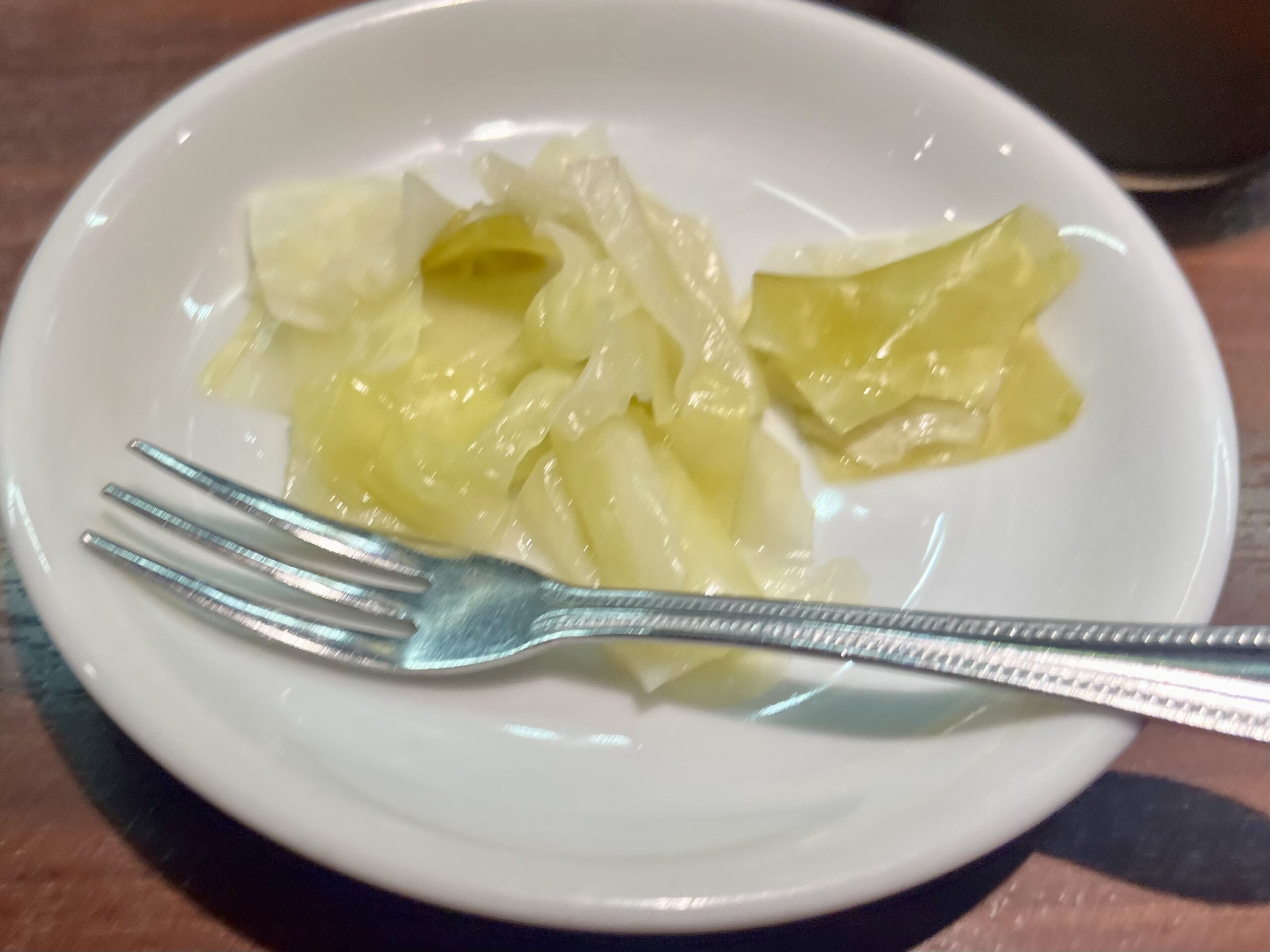 キャベツのピクルスで口の中をさっぱりさせながら食べるのが良い。