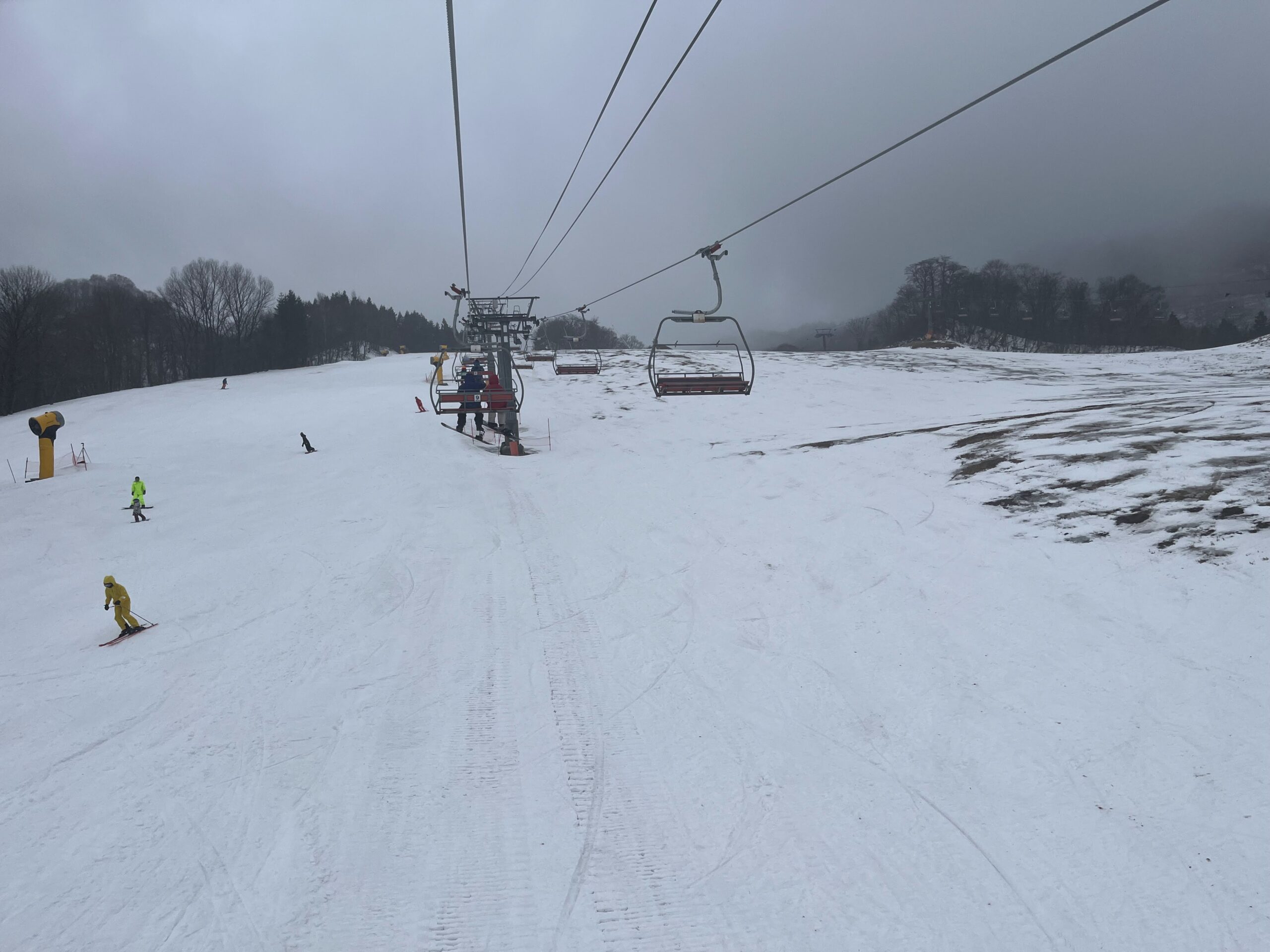 このリフト周辺では乗り場に雪がないので、スキーを抱えてリフトに乗らなければならず、ペアリフトに1人での乗車となります。